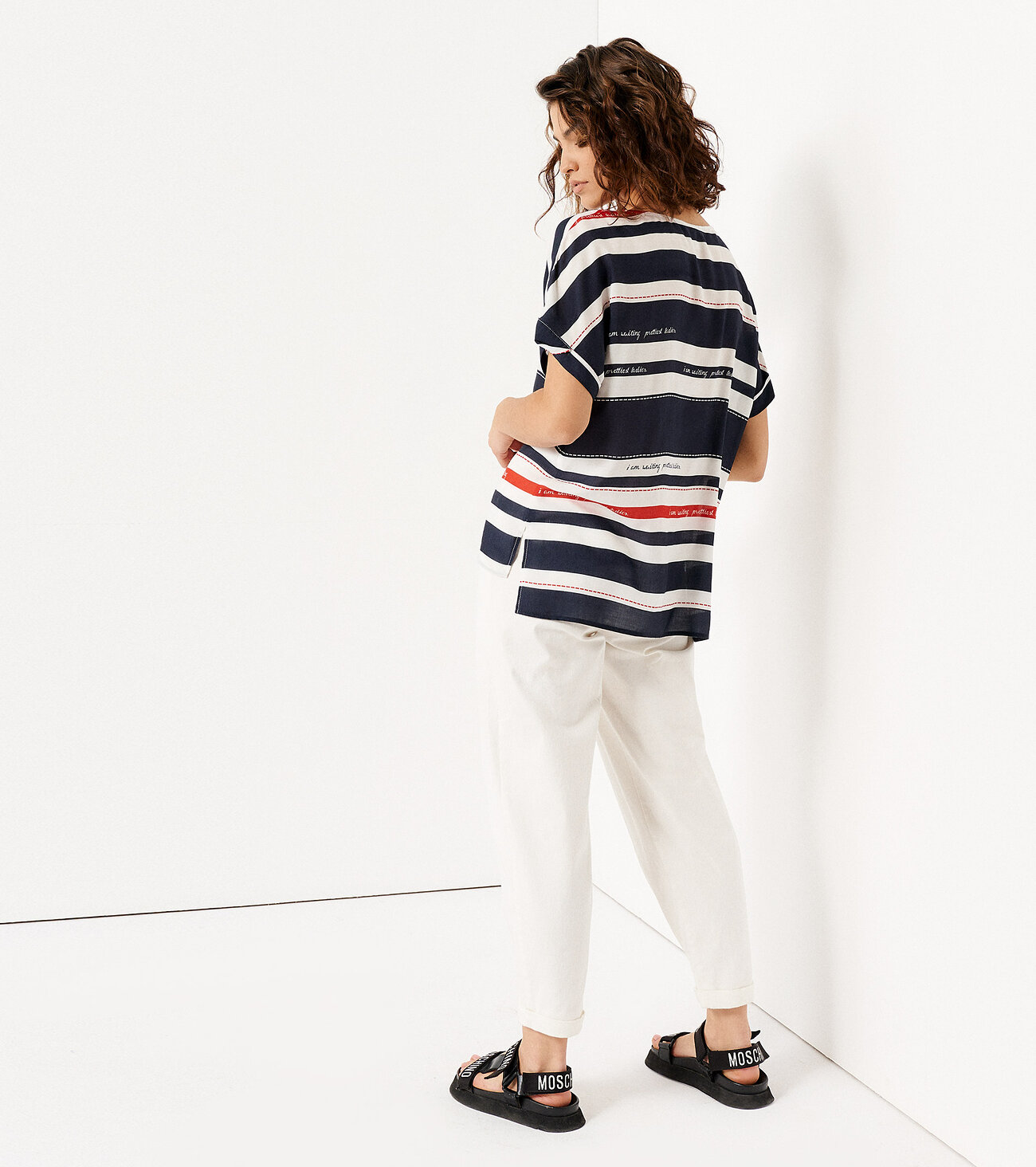 Размер 48: Длина изделия - 65см, Длина переда от высшей плечевой точки до низа - 62.5см, Ширина плеча - 28.5см, Ширина по низу - 60.5см, Ширина под проймой - 58см, Ширина рукава - 22.5см; Бело-синий