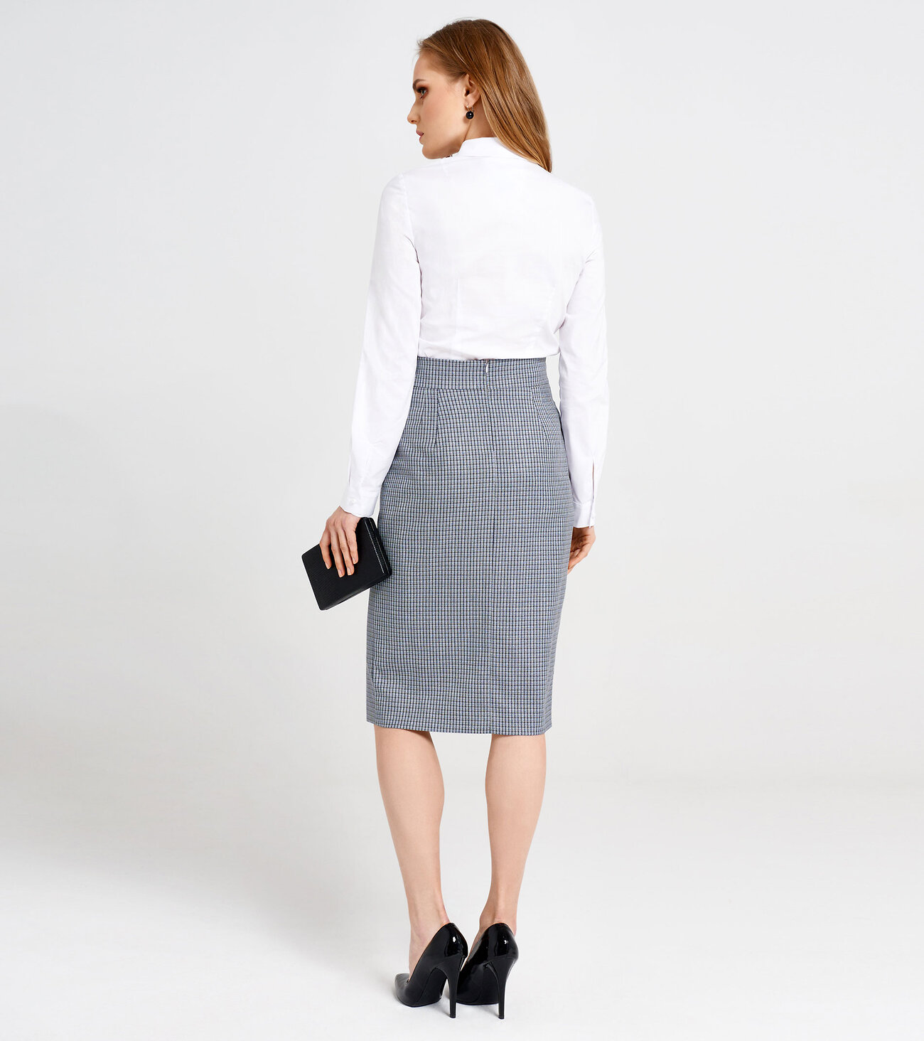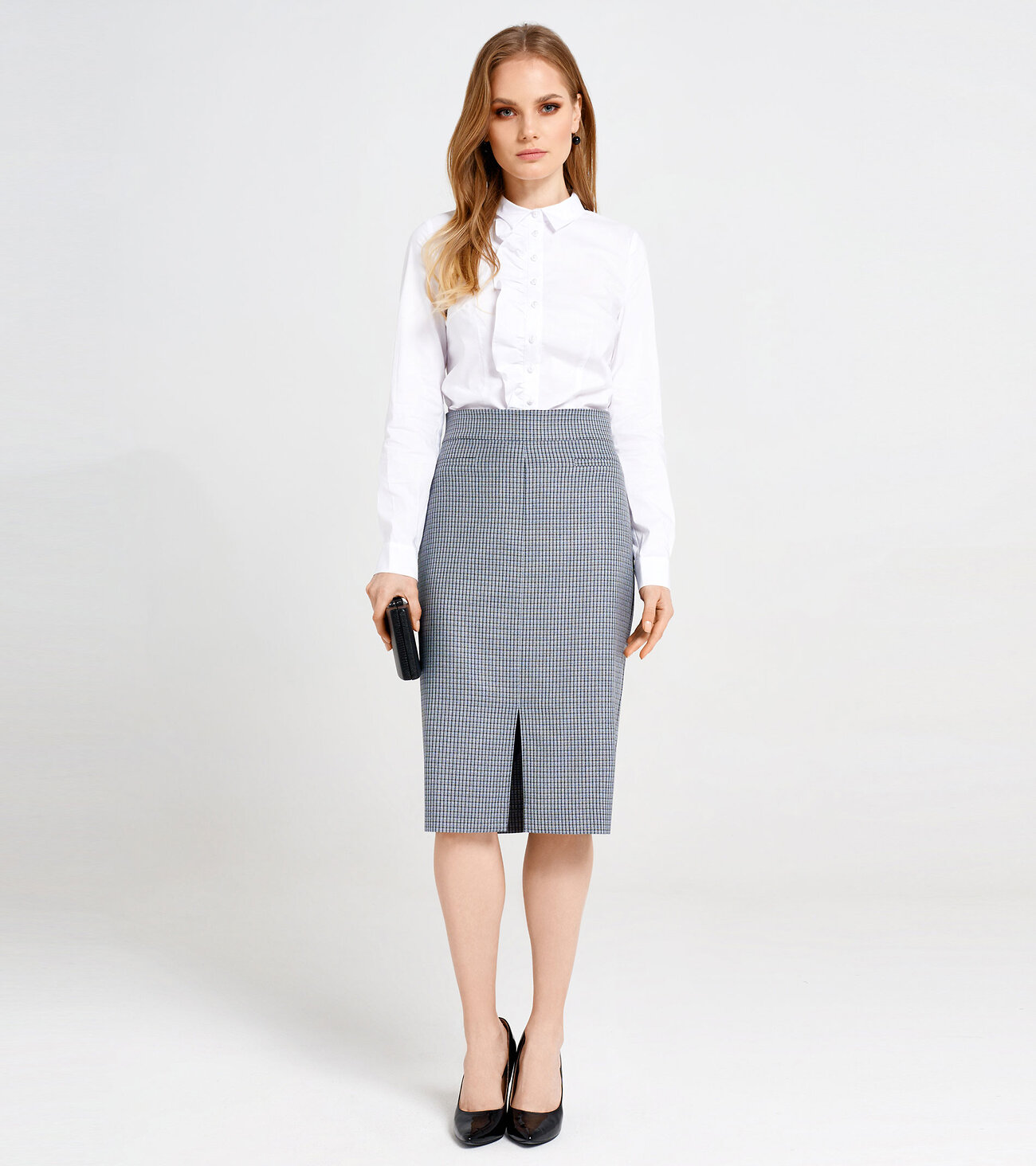 Юбка- карандаш элегантный, стильный тренд, вещь не только универсальная, но и самодостаточная, из поливискозной ткани. Юбка прилегающего силуэта с поясом на талии,с двумя боковыми карманами и средним швом заканчивающимся разрезом. Спинка со средним швом и тесьмой-молнией. Размер 42: Длина изделия - 66см, Ширина по бедрам - 45см, Ширина по талии - 33см;