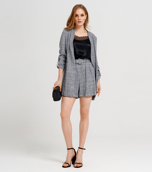 Стильные и удобные шорты из натурального льняного полотна с вискозой с рисунком в клетку. Шорты на отрезном поясе на талии, с ремнём из основной ткани, застёгивающимся на пряжку с язычком и блочками. По спинке в поясе оформлена резинка. Застёжка спереди на молнию с гульфиком и петлю-пуговицу на поясе. По бокам выполнены карманы.Также спереди выполнены защипы от верхнего среза. По низу шорт имитация отложных манжет. Размер 42: Высота посадки - 26см, Длина брюк без пояса - 35,5см, Длина по внутреннему шву - 13см, Ширина брючин сверху - 65,5см, Обхват брюк по низу - 68,5см, Ширина по бедрам - 49см, Ширина по талии - 30,5см;