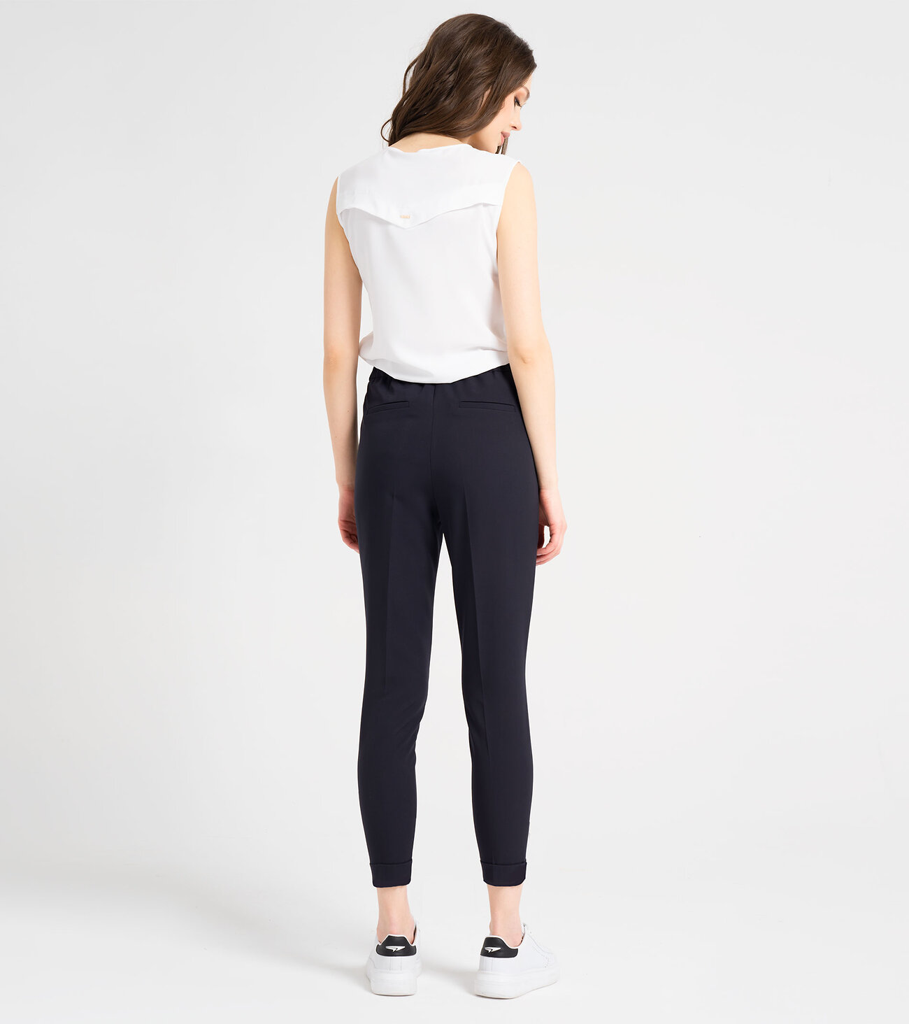 Стильные зауженные брюки длиной до щиколотки. По низу отложные манжеты. Брюки на резинке по талии. На передних и на задних частях брюк имеются карманы, по переду от пояса декоративные складочки. Отличный вариант брюк как на каждый день, так и для торжественных случаев.Размер 42: Высота посадки - 27см, Длина брюк без пояса - 86,5см, Длина по внутреннему шву - 64,5см, Ширина брючин сверху - 58см, Обхват брюк по низу - 30см, Ширина по бедрам - 46см, Ширина по талии - 28см;