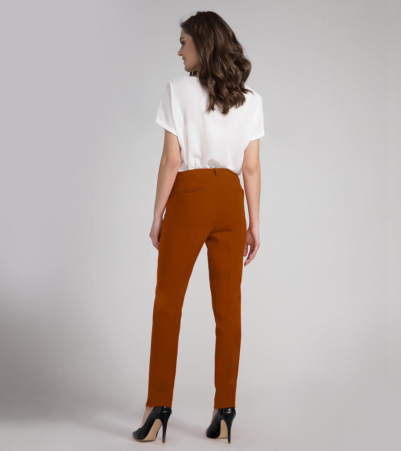 Классические брюки женские - основной элемент базового гардероба, с которым легко комбинируется множество вещей. В сочетании с блузками, топами, майками, футболками, водолазками, джемперами и пиджаками брюки женские узкие составляют восхитительные сеты для повседневной носки. Офисные брюки женские современного покроя отлично подойдут не только для работы или учебы. В них можно пойти на встречу с друзьями, в гости, кинотеатр, просто прогуляться по городу. Модель изготовлена из прочной, плотной вискозной ткани, поэтому хорошо держит форму и не сминается. Ее можно стирать в бережном деликатном режиме при низкой температуре. Брюки женские, зауженные к низу, дополнены карманами в боковых швах и их имитацией в задней части изделия. По бокам штанин - небольшие разрезы. Брюки женские зауженные застегиваются на молнию. На поясе располагается потайной крючок-застежка и шлевки для ремня. Вы можете купить брюки женские модные для создания эффектных стильных образов."Размер 42: Высота посадки - 23см, Длина брюк с поясом - 99.5см, Длина по внутреннему шву - 75см, Ширина брючин сверху - 57см, Обхват брюк по низу - 33.5см, Ширина по бедрам - 45.5см, Ширина по талии - 35см;