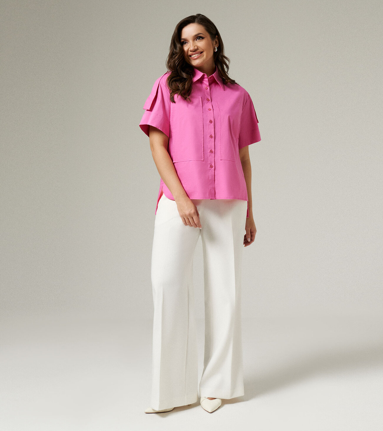 Стильная женская блуза с удлиненными нагрудными карманами станет отличной альтернативой классической рубашке в элегантных образах. Модель прямого кроя будет хорошо смотреться с классическими брюками, с прямыми и зауженными юбками, джинсами и шортами-бермудами. Блуза с коротким рукавом подойдет для офисного дресс-кода и для романтичных повседневных образов. Блуза женская будет отлично смотреться в многослойных сочетаниях с полувером или кардиганом и облегающими брюками скинни. Белая блуза гармонично сочетает в себе элементы классического стиля и casual детали. Благодаря прямому крою и широким рукавам блузка рубашка свободно садится по фигуре и оставляет полную свободу движений. В этой стильной одежде вы будете чувствовать себя максимально комфортно даже в жаркую погоду. Нарядная женская блуза с классическим воротником будет хорошо смотреться на любой фигуре. Заказать ее можно для создания образов для офиса, посещения учебного заведения, семинаров, деловых встреч или фотосессий.Размер 44: Длина изделия от высшей плечевой точки до низа - 72см, Длина переда от высшей плечевой точки до низа - 65см, Длина рукава - 22см, Ширина плеча - 19.5см, Ширина по груди - 55см, Ширина по низу - 57см, Ширина рукава - 22.5см;