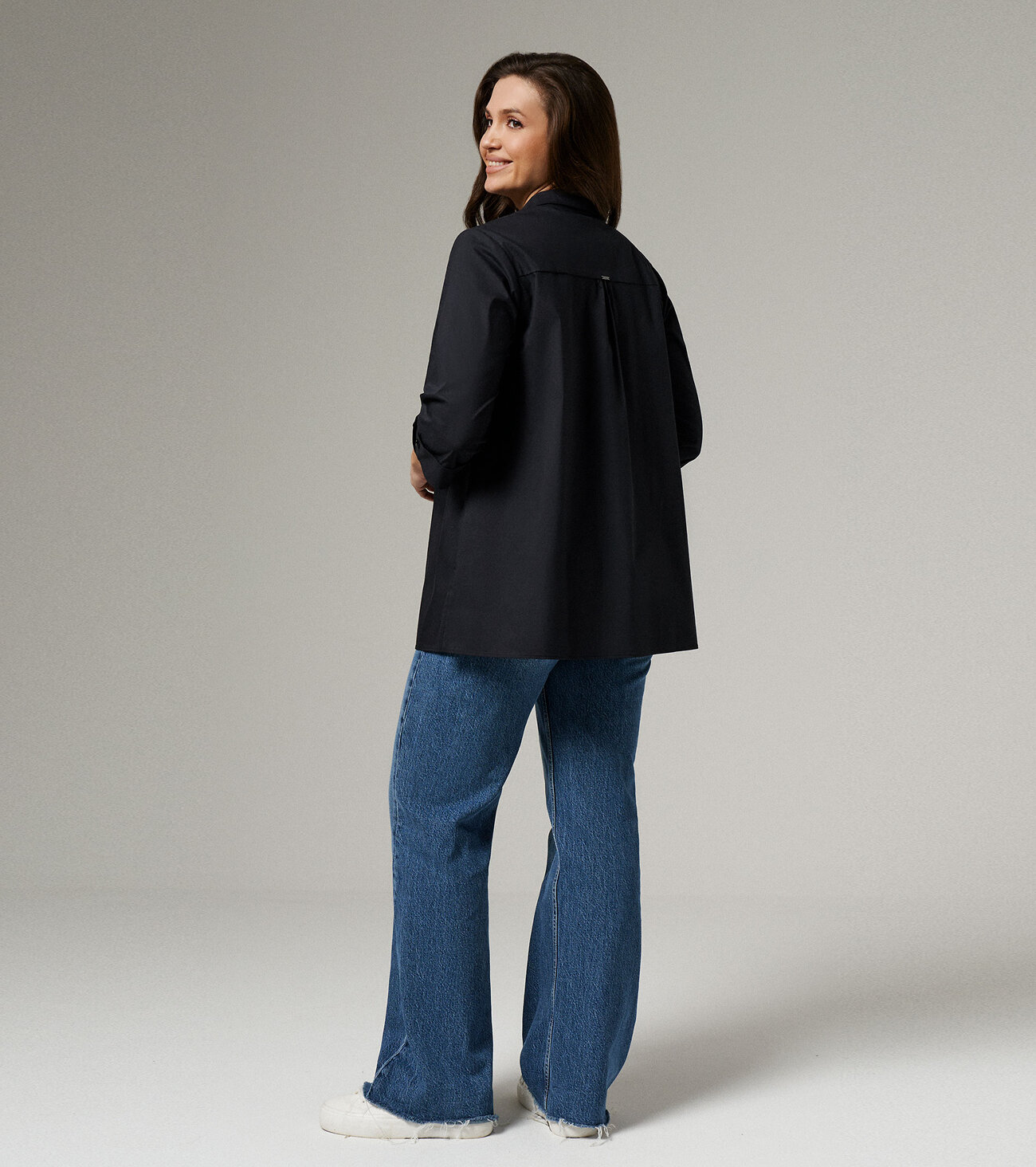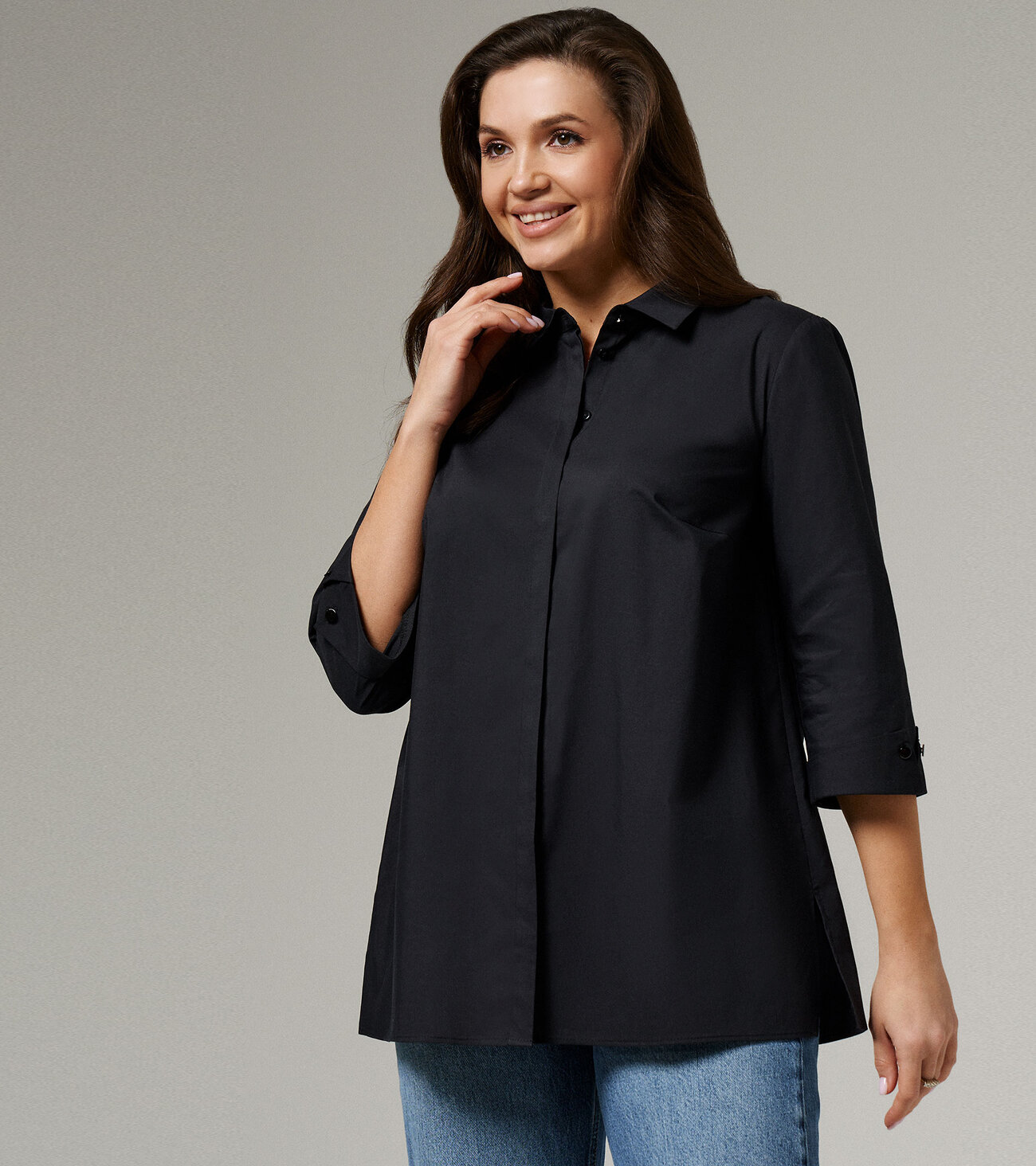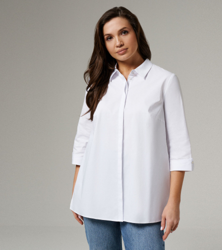 "Неизменная классика - блузка белая женская рубашечного кроя, универсальная в носке. Ее можно надеть не только на работу в офис или на учебу, но и на официальные мероприятия. Лаконичный дизайн придаст повседневным образам более строгий вид. Блузка женская с длинным рукавом больших размеров изготовлена из хлопковой ткани с полиэстером и эластаном. Рукав 7/8 с отложными манжетами украшен декоративными пуговицами и петлями. Рубашка женская белая дополнена отложным воротником сорочечного типа. Застегивается на потайные пуговицы и петли, скрытые под центральной планкой. Блузка-рубашка женская с притачной к спинке кокеткой, которая позволяет добиться идеальной посадки. В центре спинки несколько вытачек, благодаря чему ткань не топорщится. Полуприлегающий фасон формирует изящный силуэт, скрывая недостатки. Благодаря большому содержанию хлопка, рубашка хорошо пропускает воздух. Женская блузка нарядная пригодится для повседневной носки, поэтому ее можно купить для любого сезона."Размер 50: Длина рукава - 44см, Длина спинки - 69см, Обхват шеи - 42.4см, Ширина плеча - 12.8см, Ширина по бедрам - 64см, Ширина по груди - 54см, Ширина рукава - 18.4см;