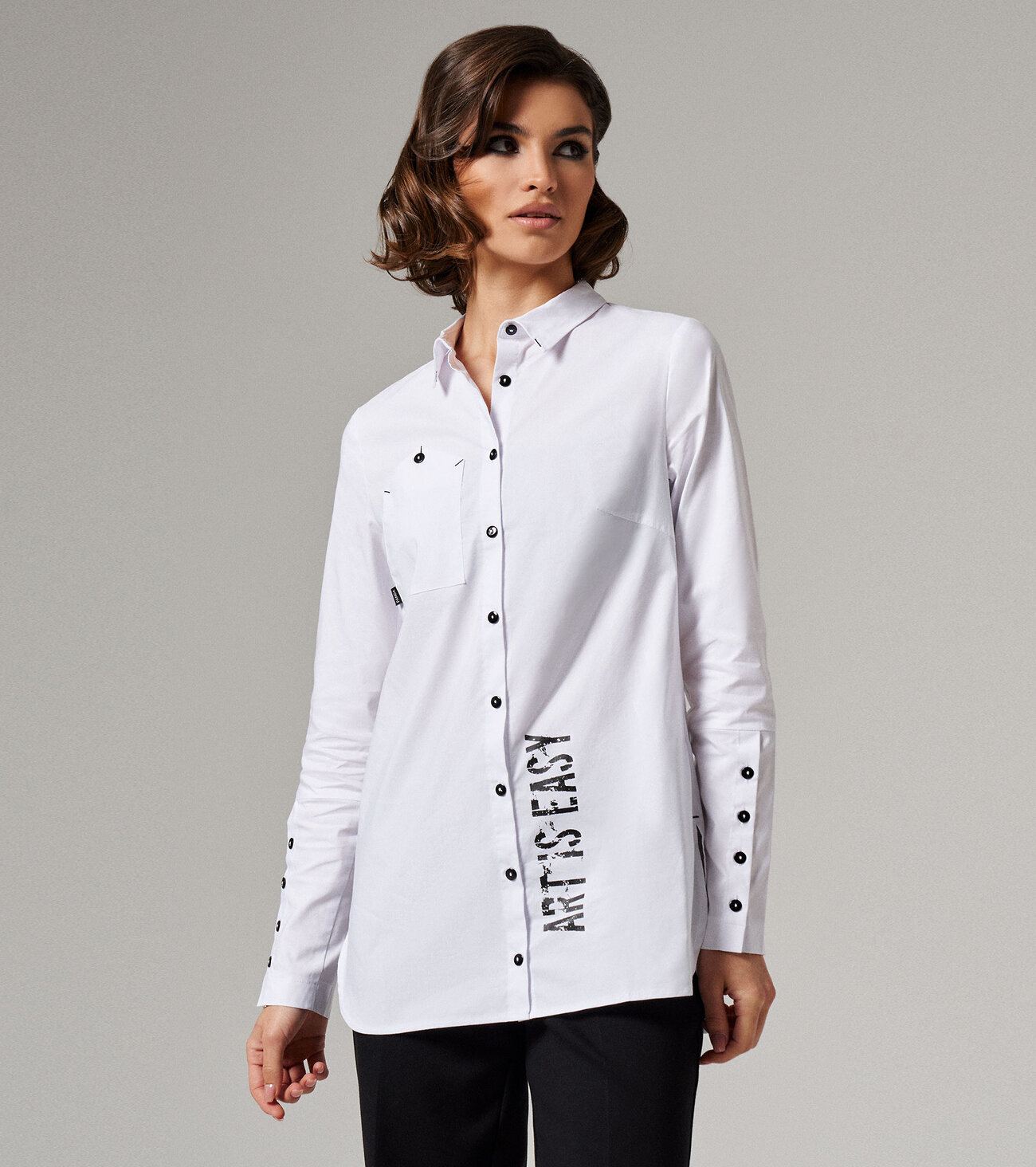 Стильная белая, хлопковая блузка, перестанет быть скучной, благодаря деталям отделки, которые дизайнеры подобрали наилучшим образом. Блузка полуприлегающего силуэта, с застежкой на петли пуговицы контрастного черного цвета, на деталях переда верхний карман, оригинальной формы, с закрепками контрастного черного цвета, на левой детали шрифтовая печать. Спинка прямая, с декоративной оригинальной печатью, придает блузки самодостаточность. В этой блузке, вы будите притягивать взгляды окружающих.Размер 42: Длина изделия - 74см, Длина рукава - 62см, Длина до талии - 42см, Обхват шеи - 42см, Ширина плеча - 11.5см, Ширина по бедрам - 48см, Ширина по груди - 47см, Ширина рукава - 17см;