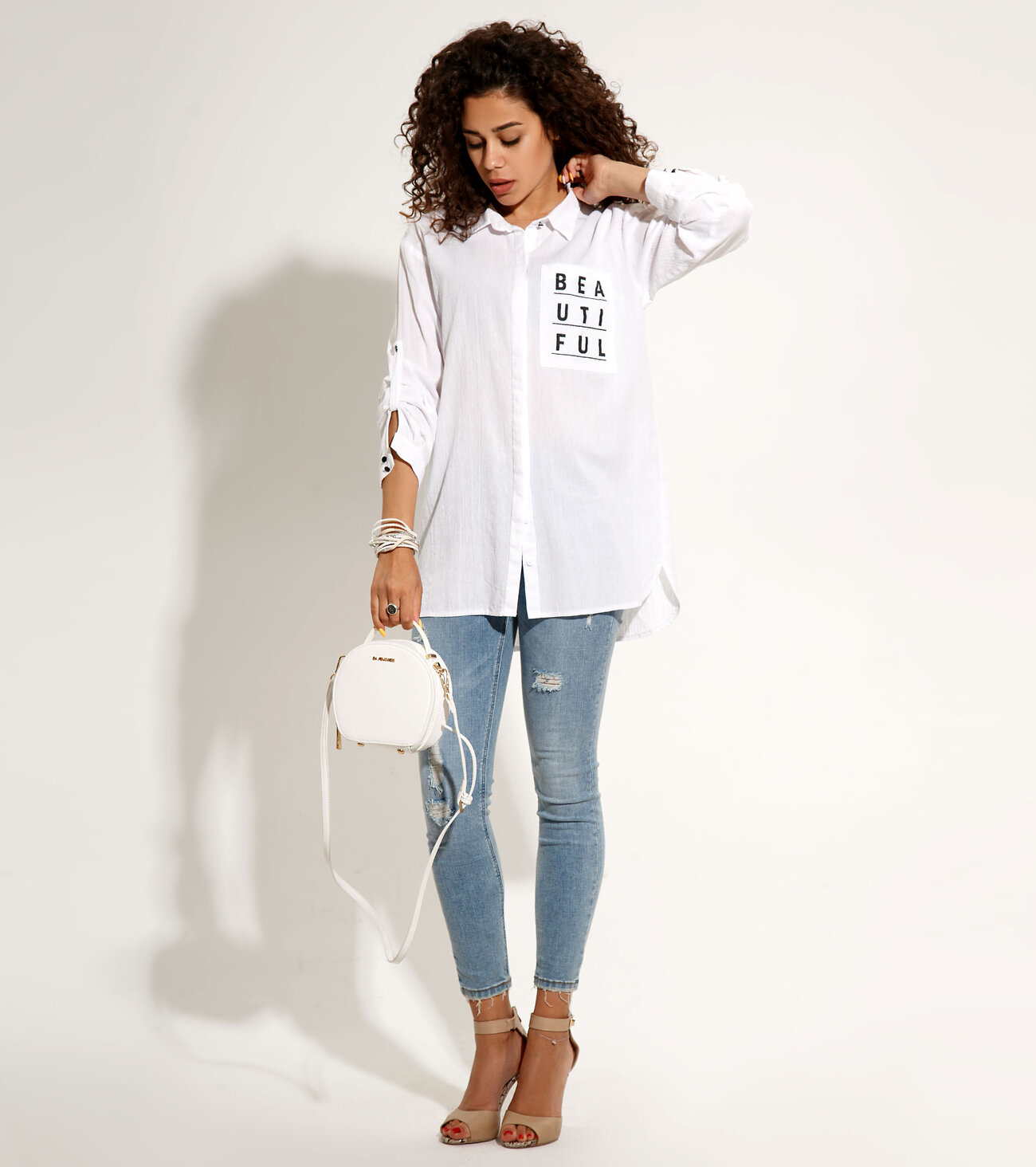 Легкая летняя блузка из 100% хлопка. Блузка прямого силуэта, с центральной застежкой на потайные петли и пуговицы и одну петлю и пуговицу на воротнике. Воротник сорочечный. Рукава длинные, по рукавам имеется декоративная пата. По переду слева большой накладной карман, который декорирован печатью. Спинка удлиненная, по спинке имеется стильная печать. Отличный летний вариант блузки в стиле кэжуал, который стильно будет сочетаться с вашими любимыми джинсами или шортами, создавая модный стильный образ.Размер 42: Длина рукава - 57см, Длина спинки - 78см, Обхват шеи - 38,4см, Ширина плеча - 16,6см, Ширина по бедрам - 52см, Ширина по груди - 50см, Ширина рукава - 20,4см;
