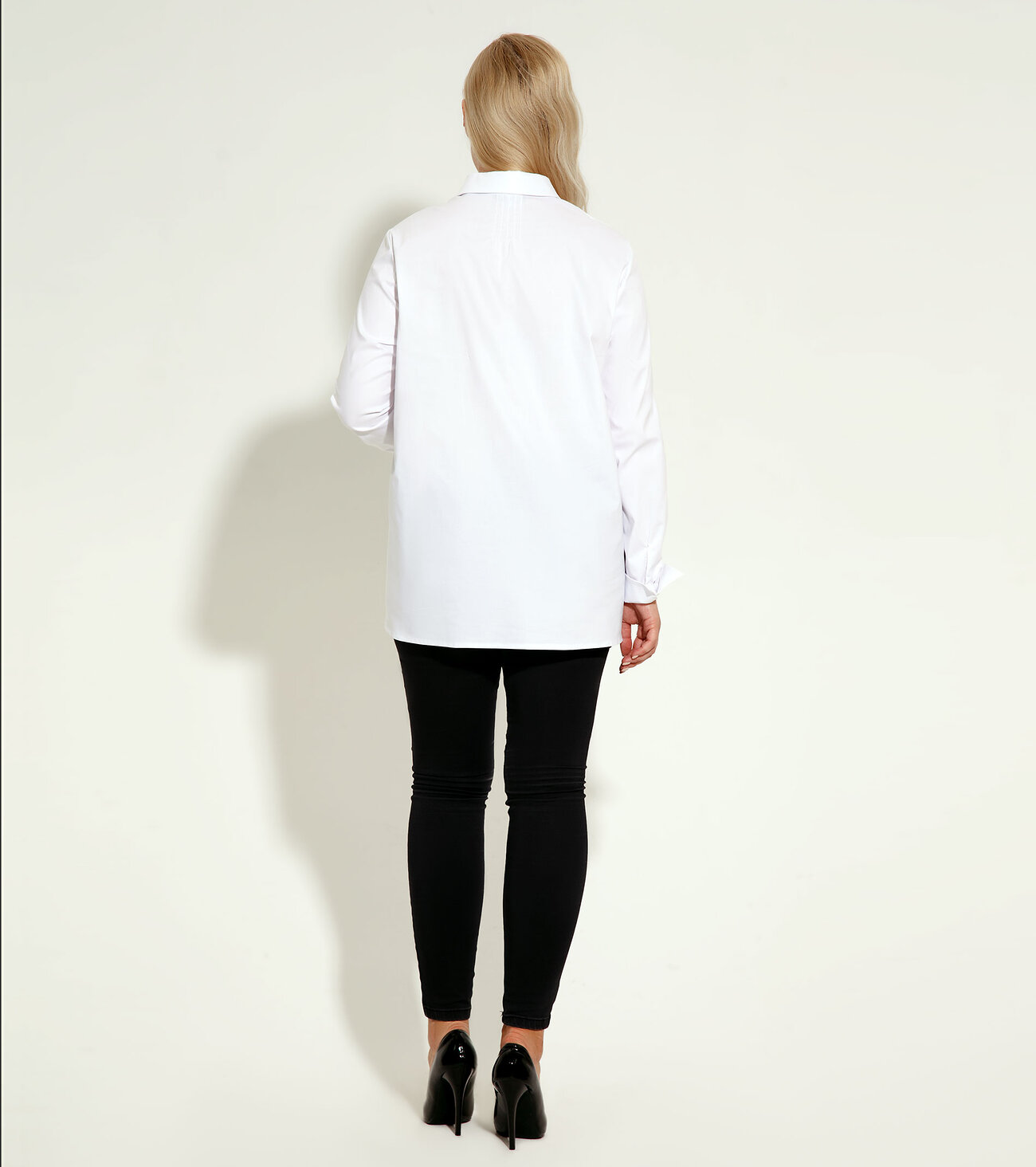 Практичная и элегантная блузка в классическом стиле выполнена из качественной хлопковой ткани с эластаном. Рукав длинный с отложным манжетом с заостренными уголками. Манжет застёгивается на одну петлю-пуговицу. Воротник рубашечный,отложной, на стойке. Застёжка спереди на отрезную планку и петли-пуговицы. По переду блузка декортрована вертикальными защипами. По спинке также выполнены короткие защипы от среза горловины. Нагрудные вытачки обеспечивают идеальную посадку на фигуру. Прекрасный вариант блузки на каждый день для стильной и энергичной девушки.Размер 52: Длина изделия - 72см, Длина рукава - 63,5см, Обхват шеи - 43,5см, Ширина плеча - 12,5см, Ширина по бедрам - 60см, Ширина по груди - 54,5см, Ширина рукава - 20см;