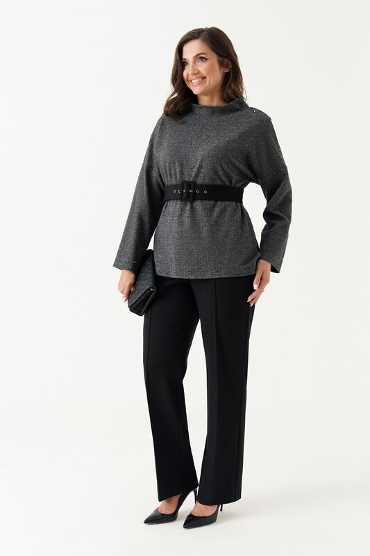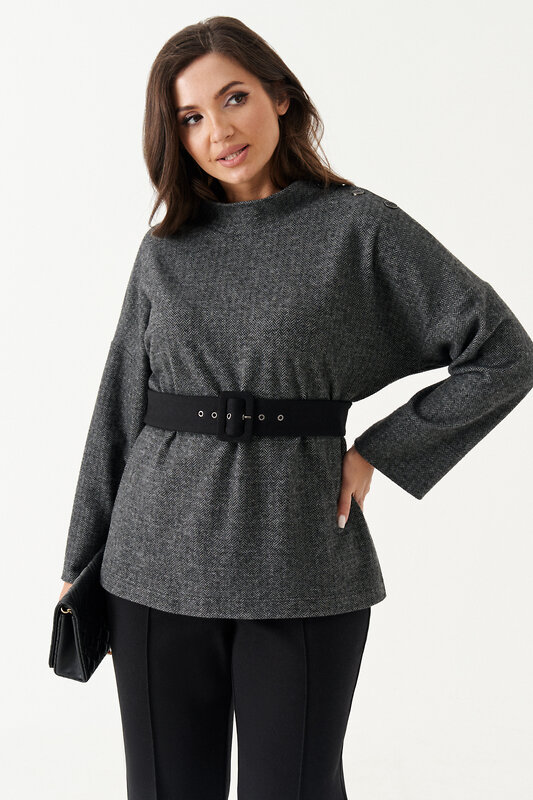 Джемпер женский из смесового трикотажного полотна для повседневной носки. Джемпер прямого силуэта. Перед имеет застежку по плечевому шву на три обметанные петли и три пуговицы. Горловина обработана воротником стойкой. Рукав спущенный, длина рукава чуть ниже локтя. В качестве дополнения для подчеркивания фигуры имеется ремень. Джемпер подойдет для любого рода мероприятий. В данном джемпере вы будете неотразимы.Размер 44: Длина изделия - 64.5см, Длина рукава - 40см, Ширина плеча - 24.5см, Ширина по груди - 54см, Ширина по низу - 55см, Ширина рукава - 21.3см;