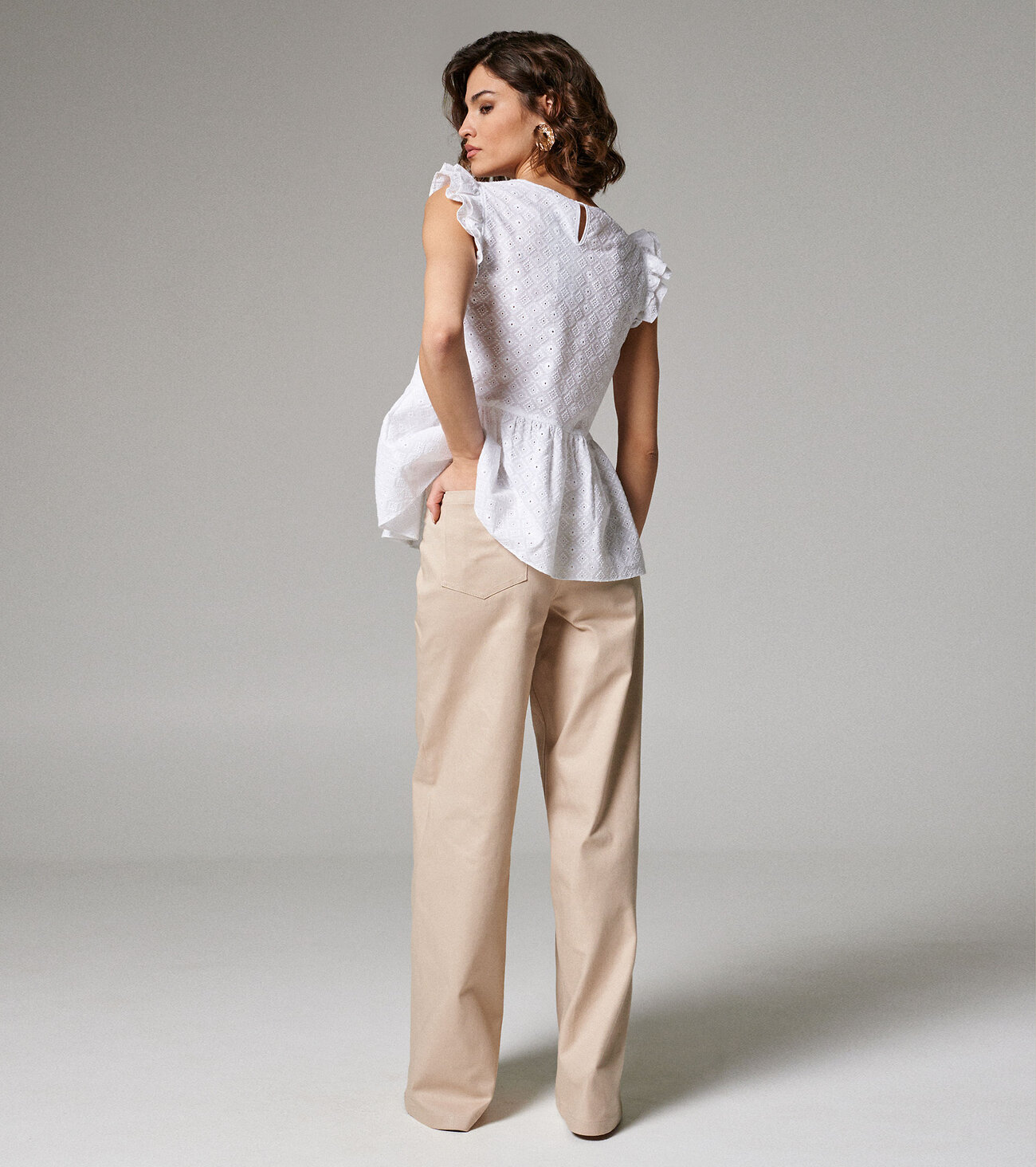 Блуза женская из хлопковой ткани для повседневной носки. Блуза свободного кроя с коротким рукавом, Низ блузы оформлен рюшей. Рукав оформлен рюшей. Горловина круглая.Размер 42: Длина изделия - 63см, Ширина плеча - 7,1см, Ширина по груди - 45см;