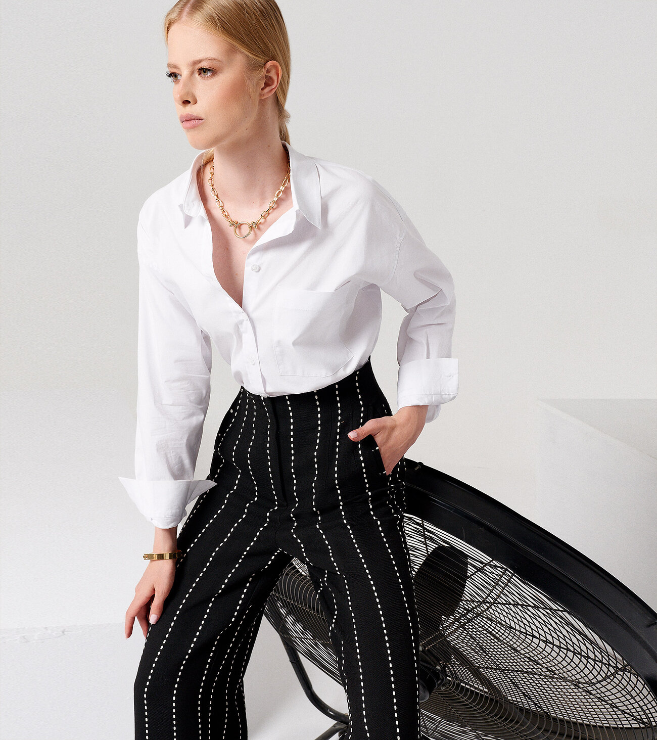 Женские брюки в полоску - стильное решение для создания летних образов. Они классические, хорошо садятся по фигуре. Брюки с высокой талией оказывают легкий эффект подтяжки, формируя красивую линию живота. Их можно сочетать с топами, футболками, блузками, рубашками. Модные брюки можно носить в повседневной жизни, создавать с их помощью деловые, нарядные образы. Брюки трикотажные женские приятные на ощупь, легкие, дарят комфорт. Вы можете купить модные штаны в стандартных размерах 42-48, предварительно сверившись с замерами в таблице.укороченные брюки женские, модные штаны, модные летние брюки, модные женские брюки, модные брюки, классические брюки женские, женские брюки высокие, женские брюки в полоску, женские брюки+, брюки трикотажные женские, брюки женские, брюки с высокой талией, брюки с высокой посадкой.Размер 42: Высота посадки - 30.5см, Длина брюк - 111см, Длина по шаговому шву - 81.2см, Ширина брючин сверху - 60см, Обхват брюк по низу - 55.5см, Ширина по бедрам - 47см, Ширина по талии - 34см;