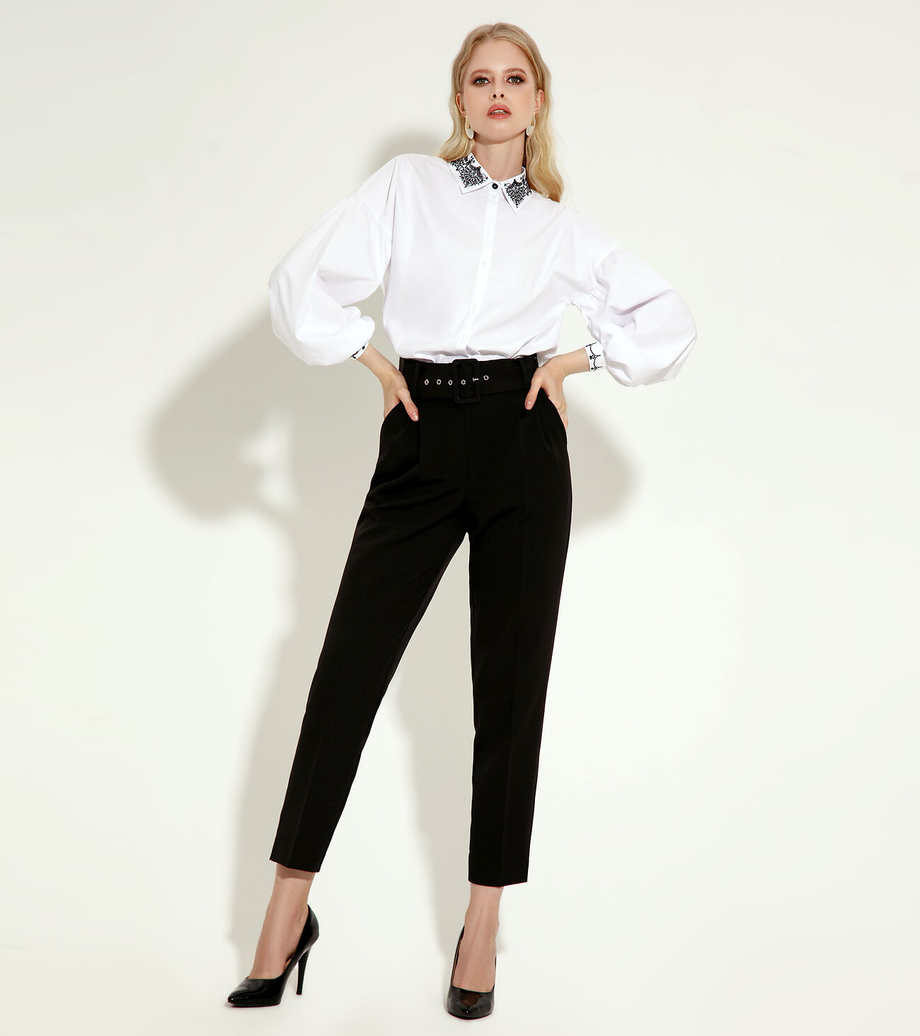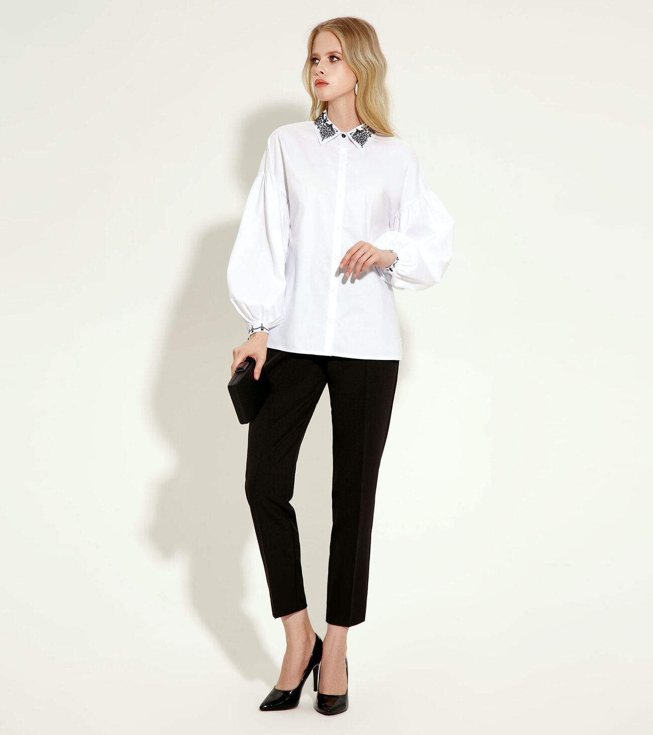 Эффектная блузка из хлопковой ткани, свободного силуэта, акцент сделан на печать на воротнике и манжетах, с центральной застежкой на петли пуговицы, линия плеча спущенная с притачной манжетой. Спинка лаконичная, со встречной складкой от горловины. Рукава объемные со сборкой и манжетой. Все эксперименты с блузкой априори будет выглядеть стильно и непревзойденно, благодаря оригинальному крою создаст потрясающий образ для уверенной в себе девушке.Размер 42: Длина изделия - 65см, Длина рукава - 47см, Обхват шеи - 41,5см, Ширина плеча - 25см, Ширина по груди - 47см, Ширина по низу - 52см, Ширина рукава - 19,5см;