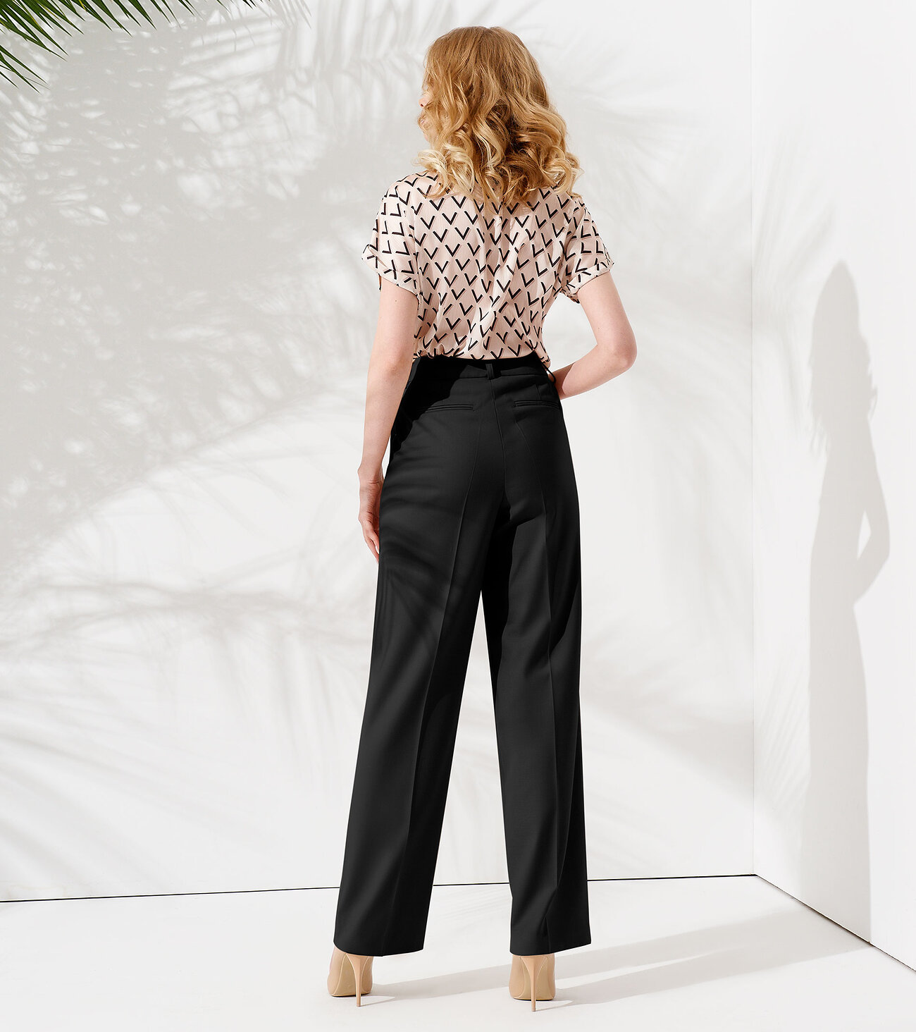 Стильные прямые широкие брюки из костюмной вискозной ткани черного цвета. Брюки прямые на поясе. По поясу имеются шлевки для ремня. Застежка на две петли и пуговицы по поясу. Брюки женские классические должны быть в гардеробе современной активной девушки. С ними можно создавать стильные повседневные образы. Брюки палаццо органично комбинируется с топом, майкой, блузкой, водолазкой, жакетом, свитером. Размер 42: Высота посадки - 27,5см, Длина брюк с поясом - 110см, Длина по внутреннему шву - 83,5см, Ширина брючин сверху - 63см, Обхват брюк по низу - 49см, Ширина по бедрам - 47см, Ширина по талии - 33,5см;