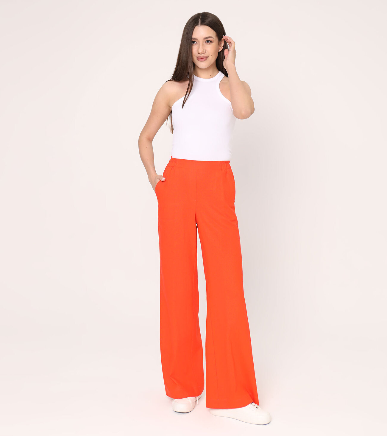 Размер 48: Высота посадки - 28,5см, Длина брюк без пояса - 108см, Длина по внутреннему шву - 84,5см, Ширина брючин сверху - 70,7см, Обхват брюк по низу - 71см, Ширина по бедрам - 53,5см, Ширина по талии - 36,5см;
