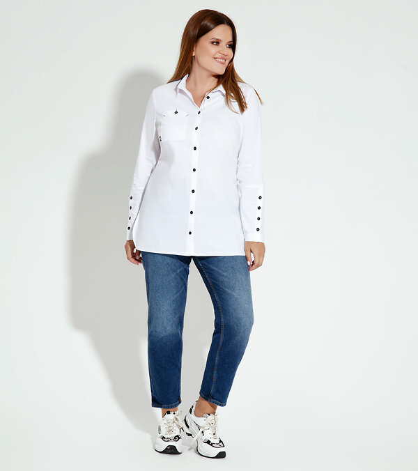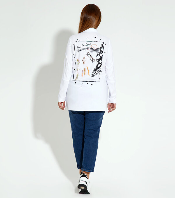Стильная белая, хлопковая блузка, перестанет быть скучной, благодаря деталям отделки, которые дизайнеры подобрали наилучшим образом. Блузка полуприлегающего силуэта, с застежкой на петли пуговицы контрастного черного цвета, на деталях переда верхний карман, оригинальной формы, с закрепками контрастного черного цвета, на левой детали шрифтовая печать. Спинка прямая, с декоративной оригинальной печатью, придает блузки самодостаточность. В этой блузке, вы будите притягивать взгляды окружающих.Размер 48: Длина изделия - 75см, Длина изделия от высшей плечевой точки до низа - 42см, Длина рукава - 62см, Обхват шеи - 44см, Ширина плеча - 12см, Ширина по груди - 52см, Ширина по низу - 56см, Ширина рукава - 18см;