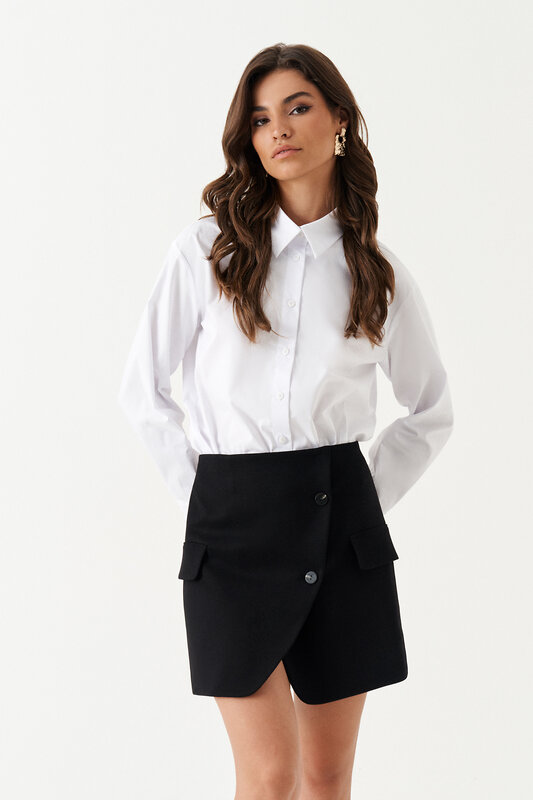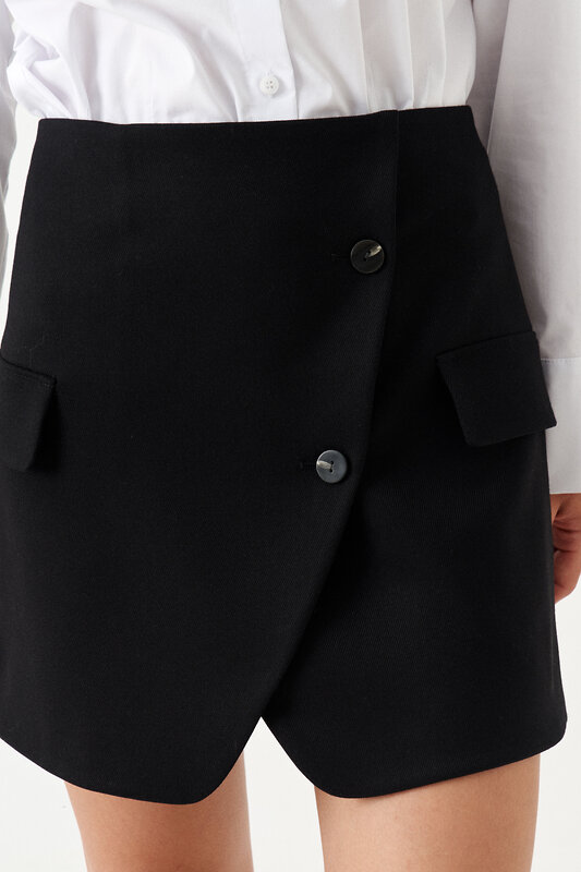 Юбка из смесовой ткани, эко кожи для повседневной носки. Юбка полуприлегающего силуэта на запах. По юбке располагаются прорезные карманы с клапаном. По спинке имеются талиевые вытачки. Длина изделия до середины бедра. Красивая и стильная юбка отлично будет смотреться на вашей фигуре.Размер 42: Длина изделия - 39.5см, Ширина по бедрам - 47см, Ширина по верхнему краю - 35.5см;