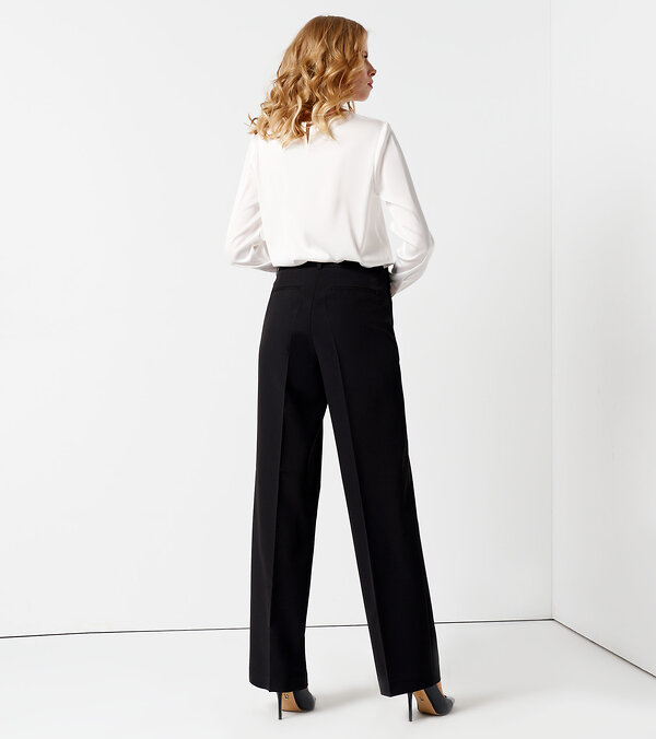 Классические женские брюки помогут вам безупречно выглядеть на работе, учебе, деловой встрече. Они составляют гармоничные ансамбли с блузами, топами, трикотажными кофтами, делая образ эффектным, женственным и элегантным. Широкие брюки прямого кроя визуально увеличивают рост с помощью стрелок. Они идеально садятся по фигуре, благодаря декоративным вытачкам. Брюки женские с высокой посадкой выгодно скрывают выступающий животик или широкие бедра. Женские штаны дополнены прорезными карманами в боковых швах и на задней части - двумя аналогичными элементами в рамку. Размер 42: Высота посадки - 27,5см, Длина брюк с поясом - 110см, Длина по внутреннему шву - 83,5см, Ширина брючин сверху - 63см, Обхват брюк по низу - 49см, Ширина по бедрам - 47см, Ширина по талии - 33,5см;