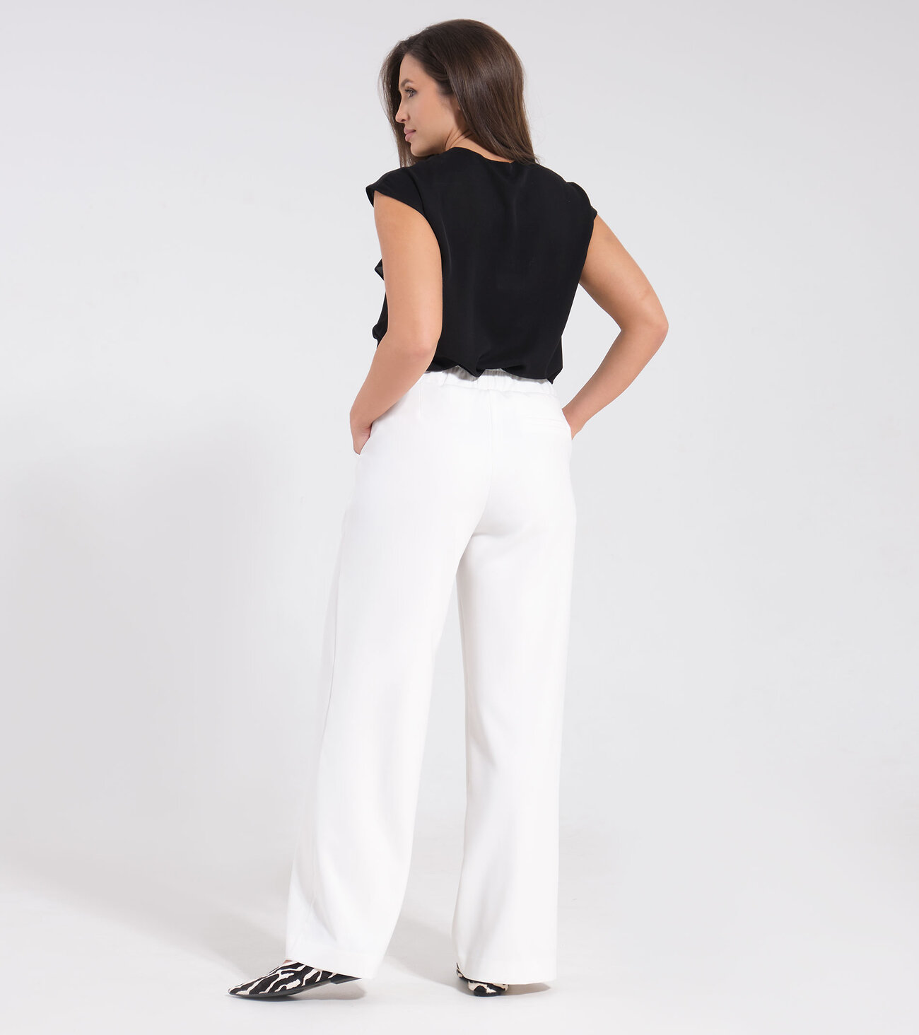 Размер 50: Высота посадки - 25см, Длина брюк с поясом - 111см, Длина по шаговому шву - 81,5см, Ширина брючин сверху - 73см, Обхват брюк по низу - 63см, Ширина по бедрам - 57см, Ширина по талии - 42см; Молочный