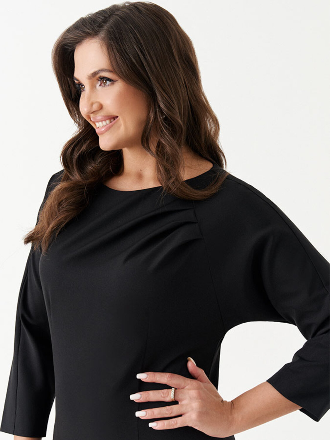 Платье из поливискозной ткани для повседневной носки. Изделие полуприлегающего силуэта с цельнокроеным рукавом. По переду и спинке талиевые вытачки. Средний шов скинки заканчивается шлицей. Левый рукав втачной. Застежка на потайную молнию в среднем шве спинки.Размер 48: Длина изделия - 98см, Длина рукава - 58см, Длина до талии - 41,5см, Ширина по бедрам - 55см, Ширина по груди - 52см, Ширина рукава - 24,5см;