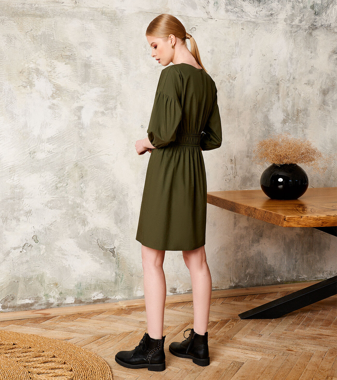 Платье мини женское- удобная одежда, которая изящно подчеркнет стройность вашей фигуры. Надевайте его на работу, учебу, встречи с друзьями, в гости, дополняйте яркими аксессуарами- и вы всегда будете в центре внимания. Лаконичное платье офисное не украшено декором, поэтому смотрится модно и современно. Особенности кроя маскируют несовершенства силуэта. Приталенный фасон с широкой резинкой на поясе делает талию тоньше. Размер 42: Длина изделия - 91см, Длина рукава - 32см, Длина спинки до подреза - 32,5см, Ширина плеча - 22,5см, Ширина по бедрам - 69см, Ширина по груди - 52см, Ширина рукава - 21см;