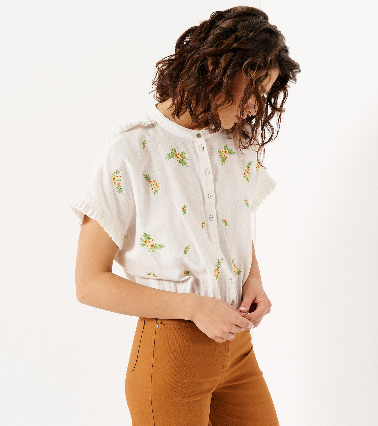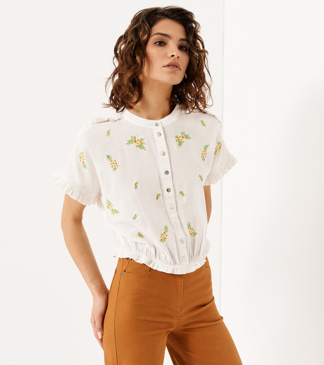 Нарядная летняя блузка из хлопка - идеальный выбор для вас. Незаменима для офисной работы, деловых встреч, посещения семинаров, прогулок с друзьями. Вышивка, сборка по низу и ряд пуговиц спереди делают блузу нарядной. Такая женская блузка подойдет для любого типа фигуры. Благодаря своему крою короткая блузка на пуговицах скроет лишний вес, визуально уравновесив плечи, бюст и бедра. Хорошо сочетается с джинсами и брюками с высокой посадкой.Размер 42: Длина изделия - 51см, Ширина плеча - 25см, Ширина по груди - 56см, Ширина по низу - 38см, Ширина рукава - 19,7см;