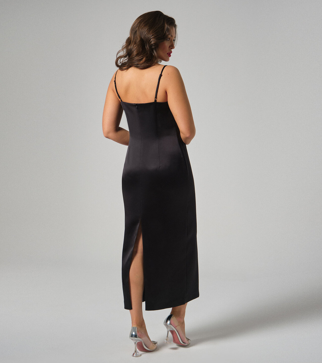 Платье женское прилегающего силуэта на бретелях. Брители регулируются. Длина платья до середины голени. Средний шов спинки заканчивается шлицей. Застегивается на потайную молнию в среднем шве спинки.Размер 46: Длина изделия - 109см, Ширина по бедрам - 52см, Ширина по груди - 47см;