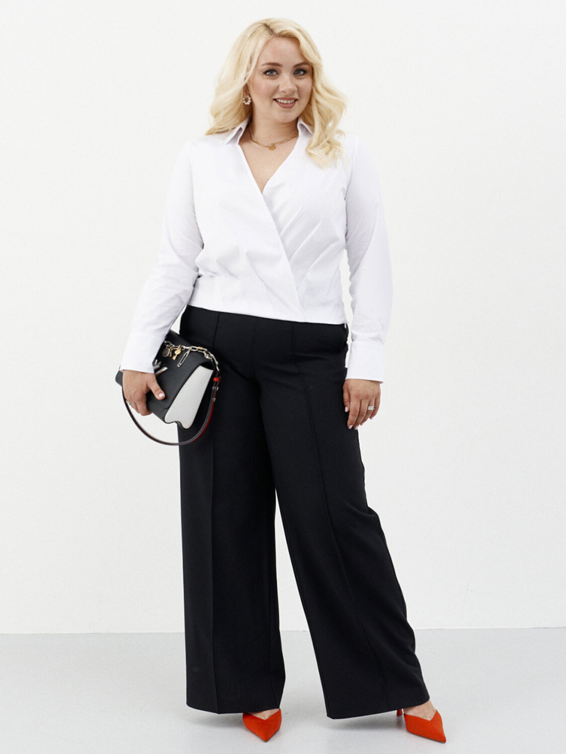 Блузка из хлопковой ткани как для повседневной носки так и для нарядных случаев. Изделие с запахом укороченное на потайной резинке. Дополнение: запах на кнопке, сбоку сделаны застроченные складки. Горловина обработана рубашечным воротником с отрезной стойкой. Рукава втачные длинные, низ рукава обработан притачной манжетой. Очень красивая и элегантная блузка, которая будет отлично сидеть на любой фигуре.Размер 44: Длина изделия - 53см, Длина рукава - 62см, Обхват шеи - 40.5см, Ширина плеча - 13см, Ширина по груди - 50см, Ширина по низу - 48см, Ширина рукава - 19.5см;
