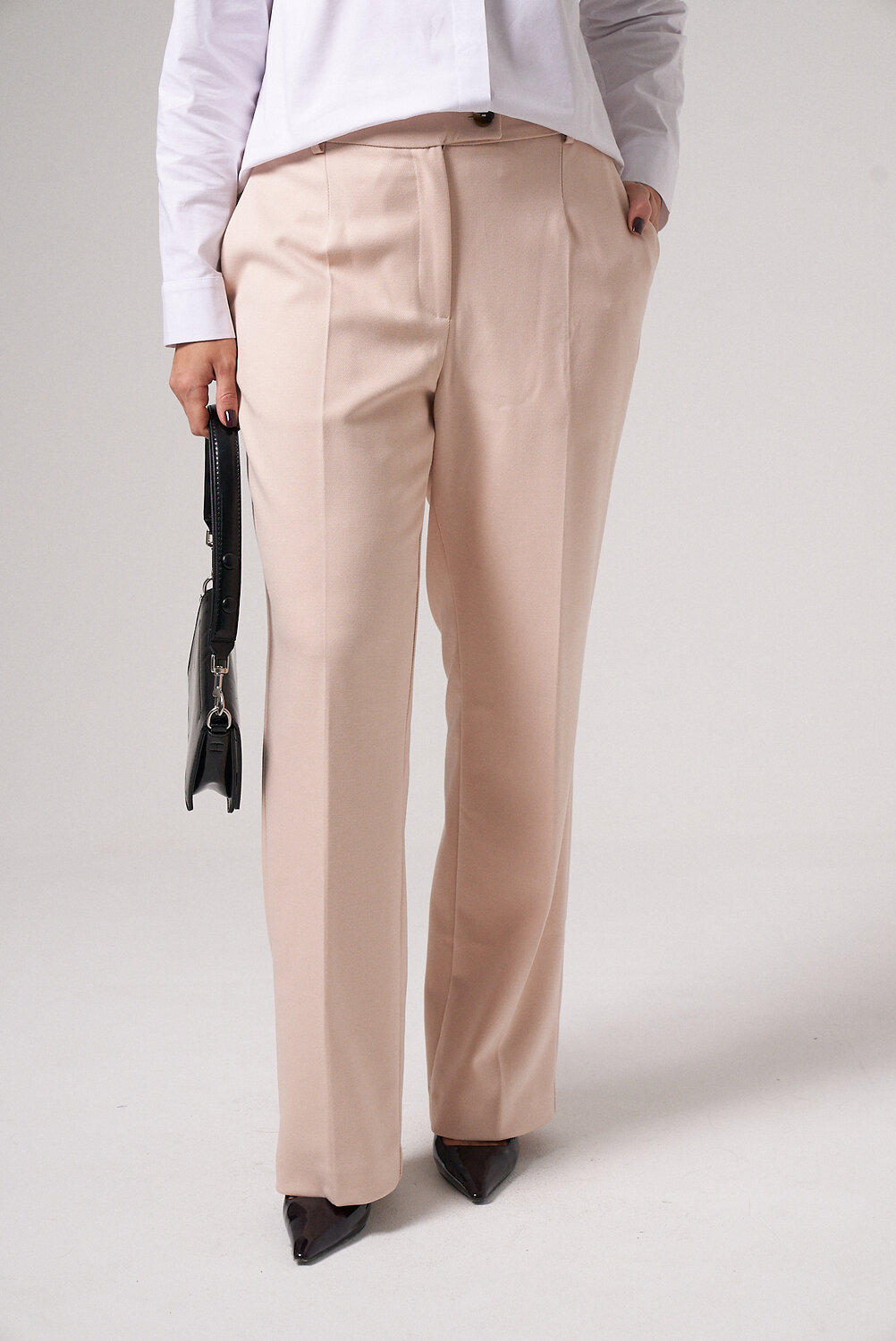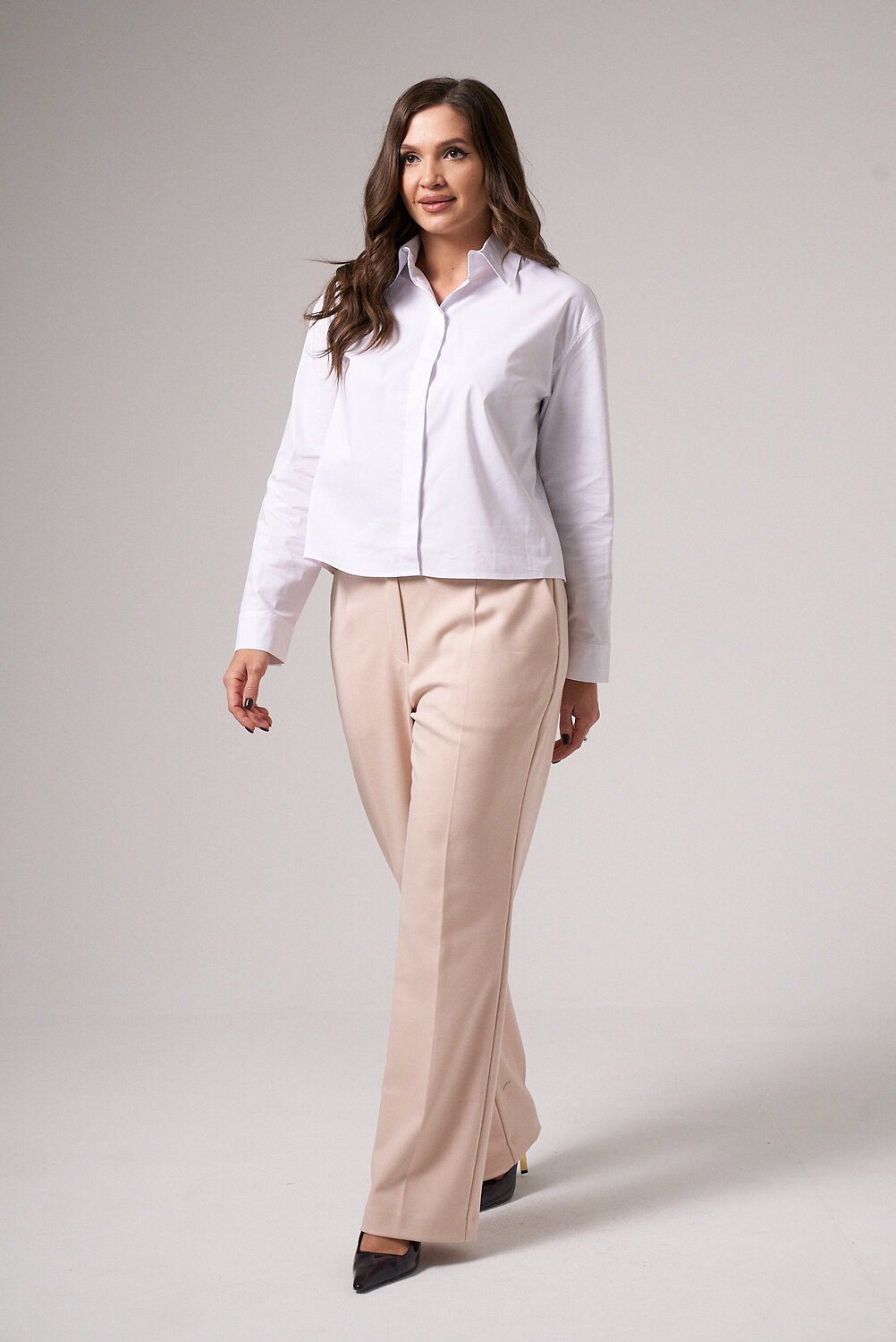 Брюки женские из поливискозной ткани для повседневной носки. Брюки прямые, слегка зауженные. На передней части брюк есть боковые карманы.Верх брюк обработан отрезным поясом, застёгивающийся на тесьму-молнию и потайной крючок. На задней части брюк есть талиевые вытаки и прорезные карманы. Ткань однотонная.Размер 52: Высота посадки - 31см, Длина брюк без пояса - 107см, Длина по внутреннему шву - 81см, Ширина брючин сверху - 71см, Обхват брюк по низу - 49.5см, Ширина по бедрам - 55см, Ширина по талии - 41.5см;