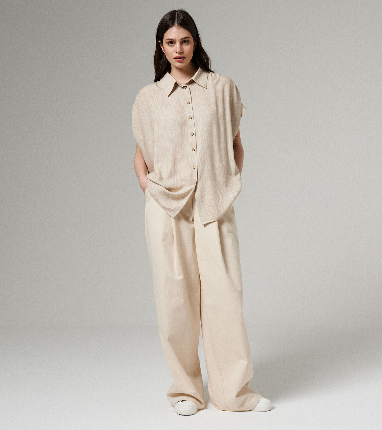 Размер 50: Высота посадки - 29см, Длина брюк с поясом - 112см, Длина по внутреннему шву - 86см, Ширина брючин сверху - 86см, Обхват брюк по низу - 66см, Ширина по бедрам - 60см, Ширина по талии - 41см; Светло-бежевый