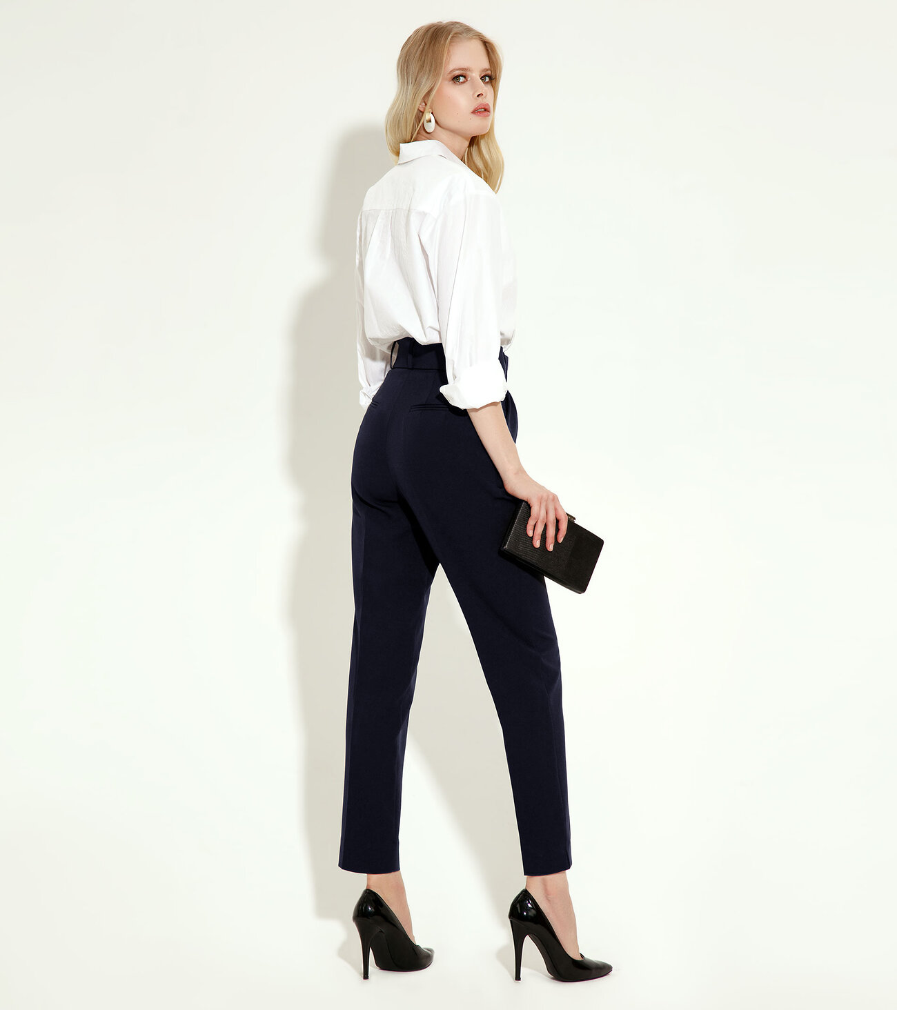 Стильные молодежные брюки с высокой посадкой на талии. Брюки заужены к низу, по низу по бокам разрезы. По переду от пояса имеются складочки. По бокам карманы. Брюки дополнены широким поясом с обтяжной пряжкой из основной ткани. Такие брюки отличный вариант как для офиса, так и для любого светского мероприятия.Размер 42: Высота посадки - 30,5см, Длина брюк без пояса - 96,5см, Длина по внутреннему шву - 73,5см, Ширина брючин сверху - 62см, Обхват брюк по низу - 33см, Ширина по бедрам - 47,5см, Ширина по талии - 32,5см;