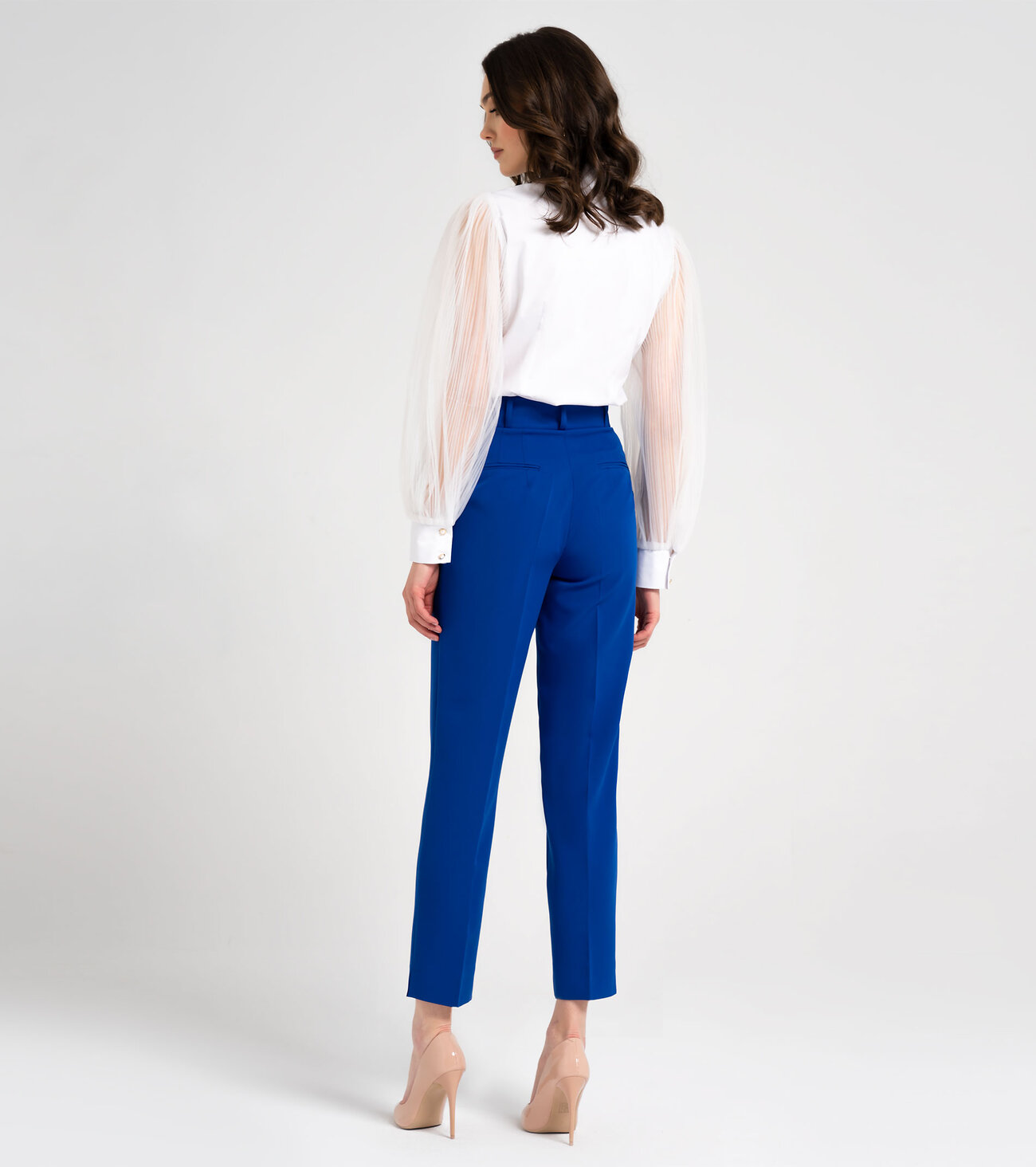 Стильные молодежные брюки с высокой посадкой на талии. Брюки заужены к низу, по низу по бокам разрезы. По переду от пояса имеются складочки. По бокам карманы. Брюки дополнены широким поясом с обтяжной пряжкой из основной ткани. Такие брюки отличный вариант как для офиса, так и для любого светского мероприятия.Размер 42: Высота посадки - 30.5см, Длина брюк без пояса - 96.5см, Длина по внутреннему шву - 73.5см, Ширина брючин сверху - 62см, Обхват брюк по низу - 33см, Ширина по бедрам - 47.5см, Ширина по талии - 32.5см;
