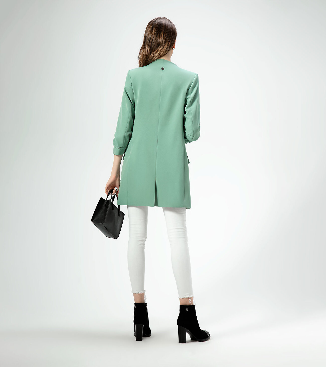 Стильный модный жакет в стиле "кэжуал". Это повседневный удобный и практичный жакет, который отлично сочетается как с джинсами, так и с брюками. Жакет удлиненный, без застежки, рукава длиной ниже локтя. По переду имеются карманы. Спинка со средним швом, который заканчивается шлицей. Жакет на подкладки.Размер 42: Длина изделия - 82см, Длина рукава - 51см, Ширина плеча - 13см, Ширина по груди - 46см, Ширина по низу - 51см, Ширина рукава - 18см;