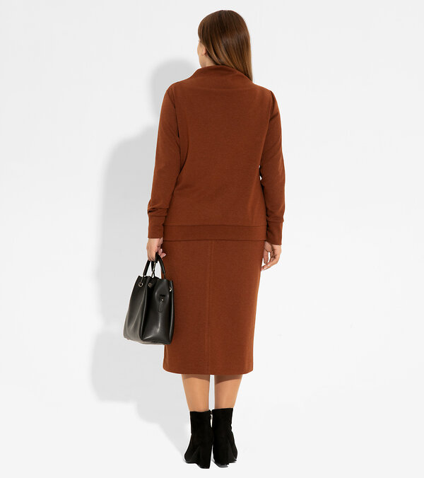 Элегантный трикотажный 2-хпредметный костюм. Максимально удобный и мягкий костюм выглядит очень презентабельно и эффектно. Маскирует недостатки фигуры и подчёркивает достоинства. Джемпер прямого силуэта с втачными длинными рукавами с высокими отрезными двойными манжетами по низу. Воротник двойной мягкой формы ,оформлен в резы фигурной формы,выполненные по переду и спинке Юбка -карандаш длиной до середины голени также выполнена из мягкого и формоустойчивого трикотажного полотна.На поясе с резинкой .От боковых швов спереди оформлены косые входы во внутренние карманы.Мешковины карманов настрочены на переднее полотнище юбки изнутри. Размер 54: Длина изделия - 62,5см, Длина рукава - 62см, Ширина плеча - 11см, Ширина по груди - 58см, Ширина по низу - 54,5см, Ширина рукава - 19,5см; Юбка