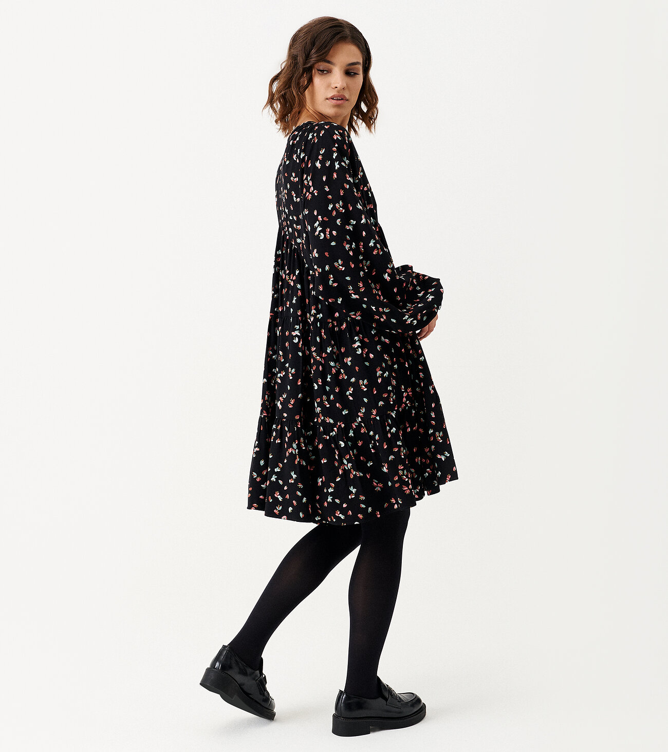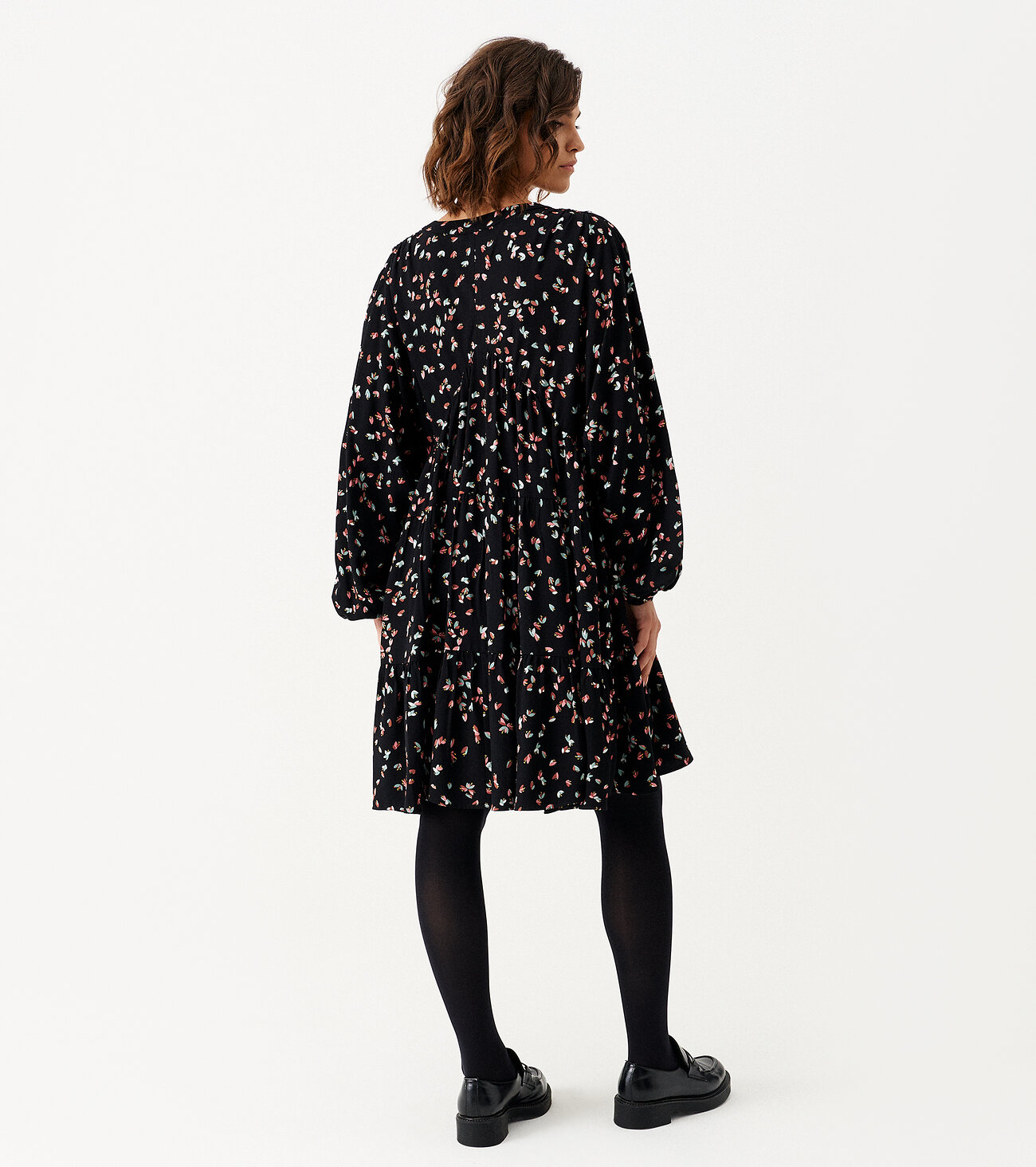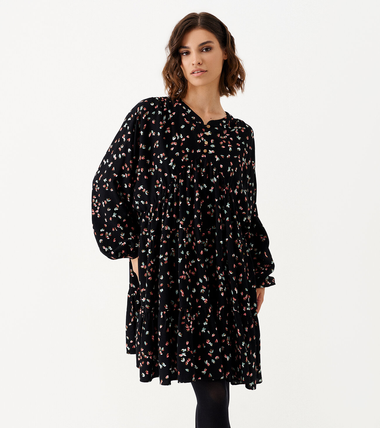 Платье женское из вискозной ткани для повседневной носки. Силуэт платья расширен к низу. У издения три отрезных яруса на сборке, застежка фронтальная на три петли пуговицы. Рукав длинный, оформлен манжетой. Ткань черная в мелкий цветочек.Размер 42: Длина изделия - 85см, Длина рукава - 69см, Ширина по груди - 56см, Ширина рукава под проймой - 32.5см;