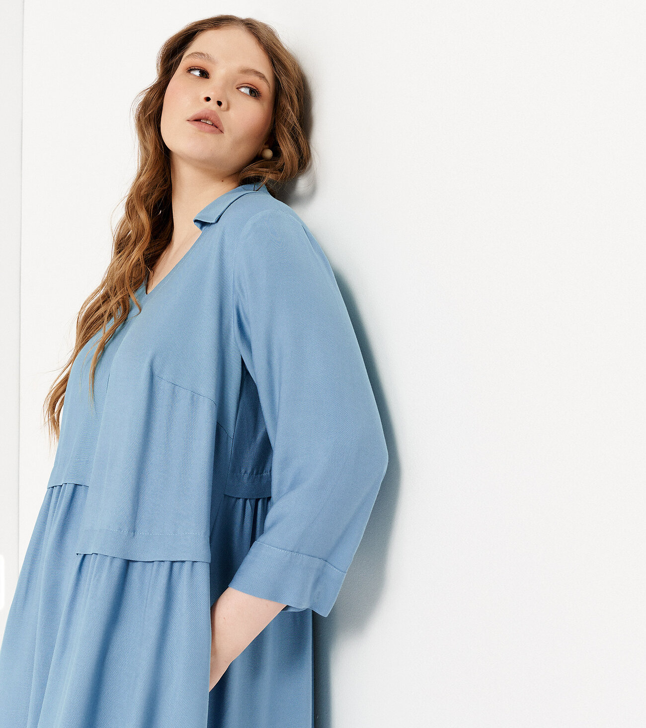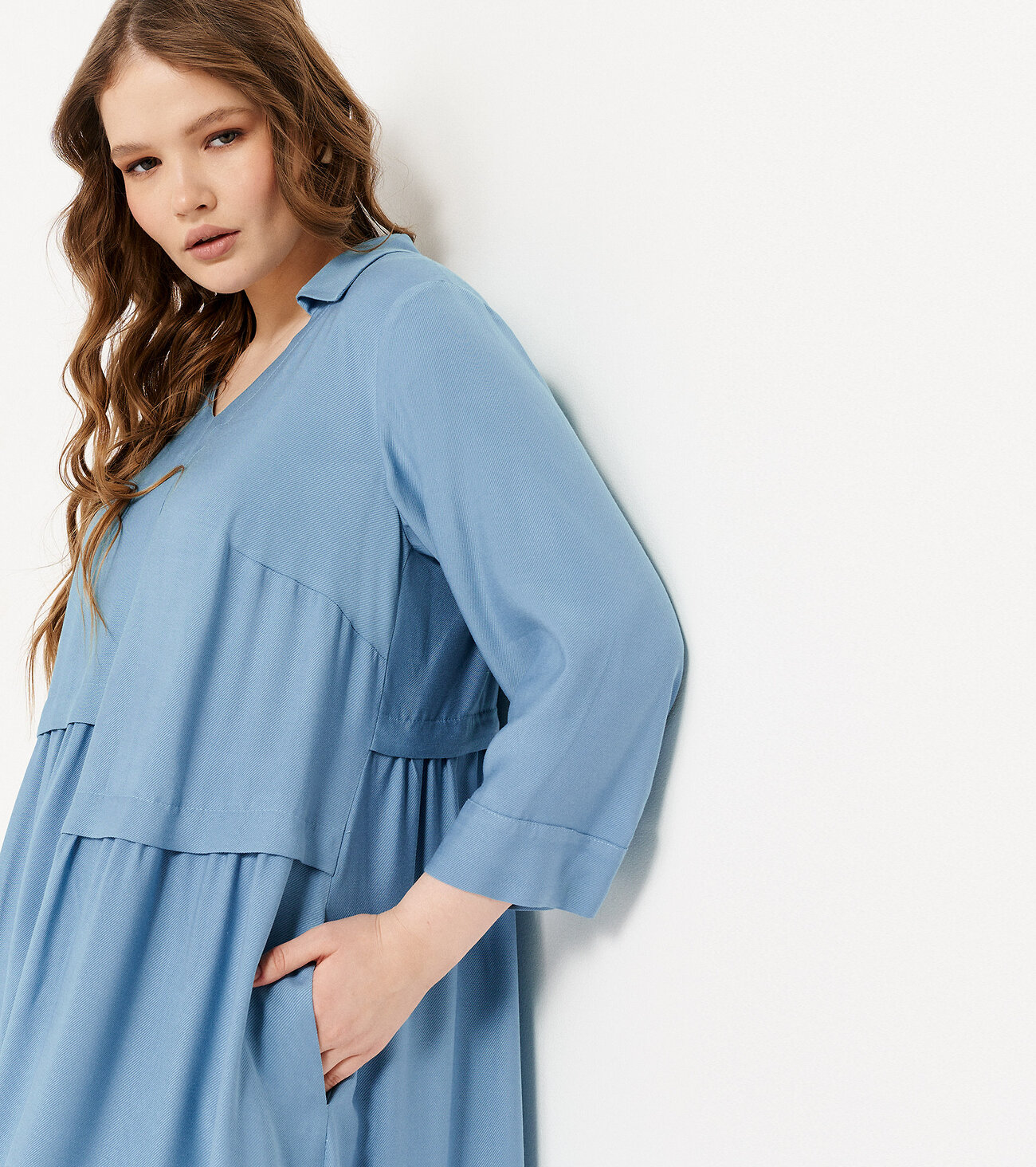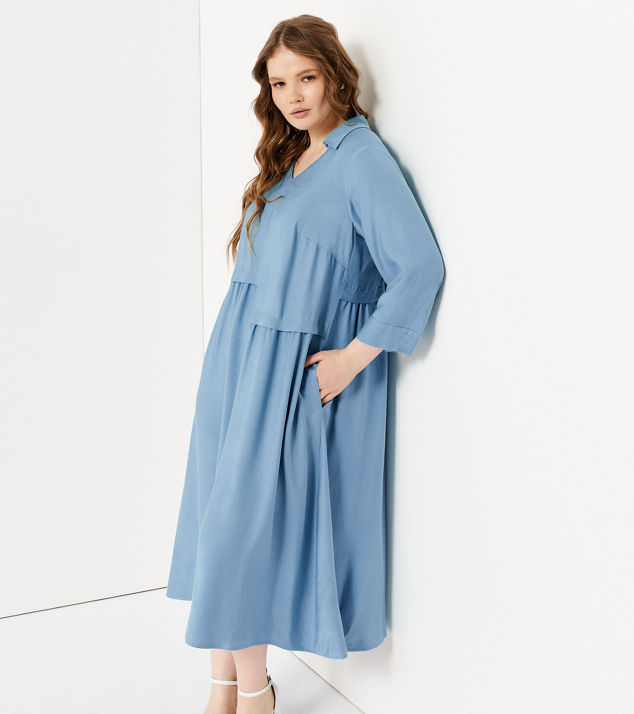 Платье женское повседневное способно подчеркнуть достоинства фигуры, благодаря свободному крою. Эта элегантная модель подойдет для повседневной носки и особых случаев. Платье-оверсайз длиной ниже колена дополнено прямым рукавом длиной ¾ и вырезом горловины в форме буквы V. В качестве дополнения выступает воротник рубашечного вида. Необычно смотрится асимметрия правой и левой полочек переда изделия, а защипы создают эффект волн на юбке. Летнее платье из вискозы также будет удобным для беременных. Воздухопроницаемая ткань создает комфортные ощущения даже в жаркий день. Вы можете купить платье для полных женщин прямо сейчас. В наличие большие размеры 52-60.Размер 52: Длина изделия - 124см, Длина рукава - 46см, Длина спинки до подреза - 40см, Ширина плеча - 12,3см, Ширина по бедрам - 76см, Ширина по груди - 57см, Ширина рукава - 21,4см;