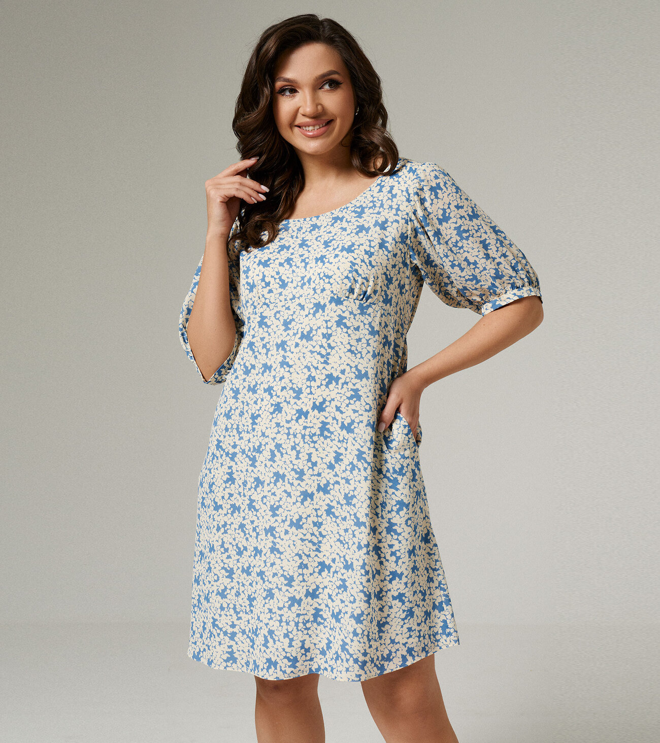 Платье женское полуприлегающего силуэта для повседневной носки. Платье на вискозной подкладке с коротким втачным рукавом оформленым притачной манжетой. Перед с подрезом под грудью и сборкой. Молния в среднем шве спинки. В боковые швы вставлены шнурки для приталивания, завязывающиеся на спине. Длина изделия до середины бедра.Размер 42: Дл.спины от высшей плечевой точки до талии - 41,5см, Длина изделия - 87см, Длина рукава - 15,8см, Ширина плеча - 6,3см, Ширина по бедрам - 59см, Ширина по груди - 49см, Ширина рукава - 28см, Ширина рукава внизу - 30,5см;