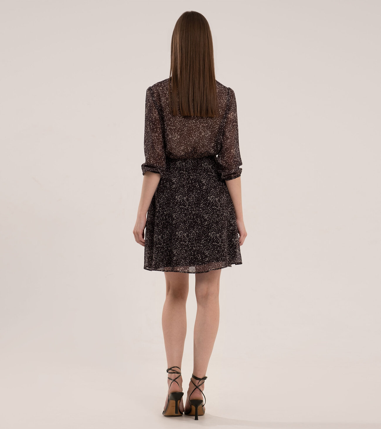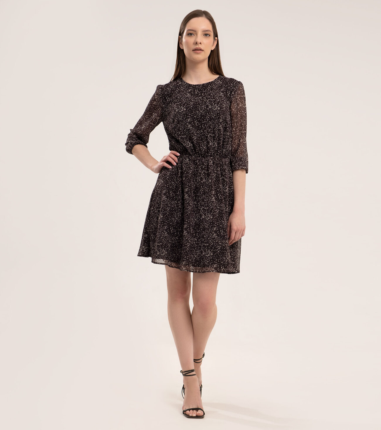 Нарядное платье из шифона в нежный принт. Платье без воротника, с овальным вырезом горловины. Рукав 3/ 4, расширенный, по нижнему срезу собран на резинку. Платье отрезное по линии талии, со сборкой на резинку. Перед и юбка на подкладке.Размер 42: Длина изделия - 90см, Длина рукава - 47см, Ширина плеча - 10,5см, Ширина по груди - 47см, Ширина по подрезу - 32см, Ширина рукава - 17см;