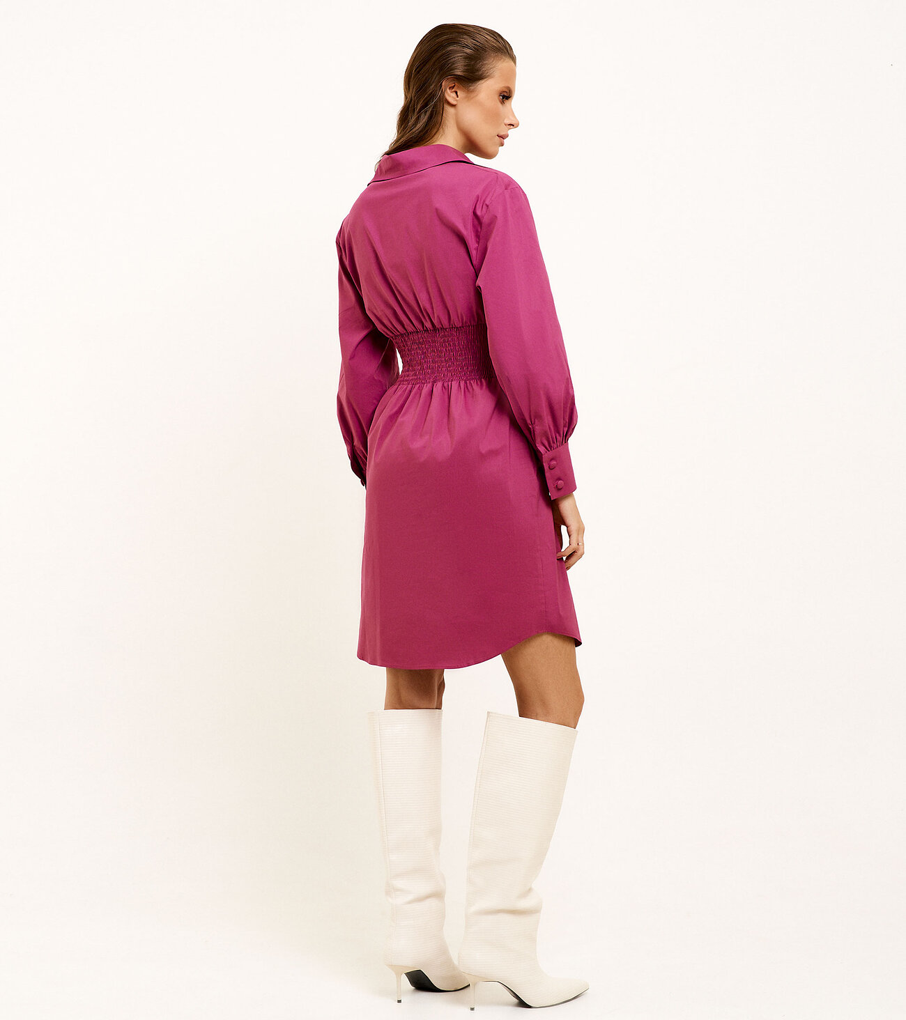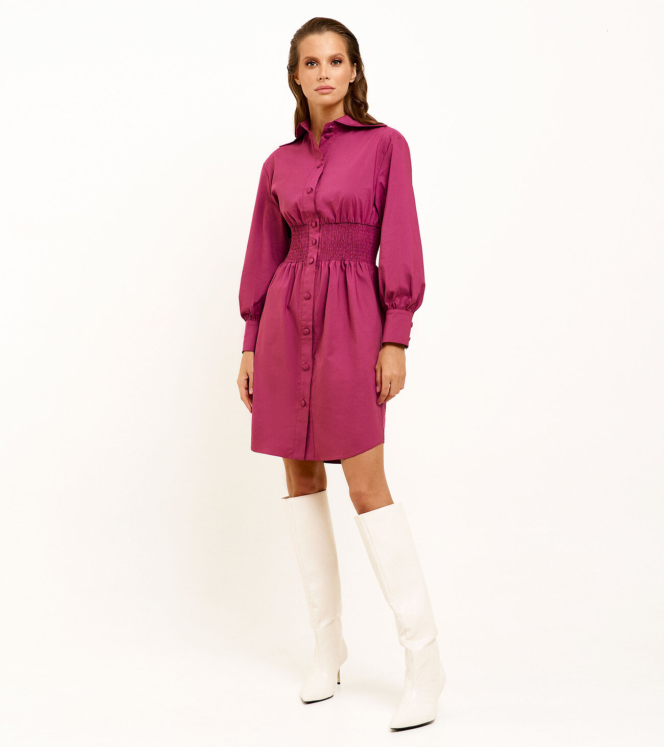 Элегантное женское платье на пуговицах станет находкой для демисезонного гардероба. В нем можно смело отправиться на учебу, работу, встречу, сходить в кино или в ресторан. Повседневное платье подойдет на весну и осень. Оно не парит, в нем комфортно как в теплые, так и в прохладные дни, особенно в сочетании с верхней одеждой. Хлопковое платье с длинным рукавом и отложным воротником слегка закруглено понизу, что делает модель кокетливой. Чтобы сделать фигуру стройнее, модельеры предусмотрели наличие широкой резинки по линии талии. Вы можете купить короткое женское трикотажное платье по выгодной цене.Размер 42: Длина изделия - 94см, Длина рукава - 56см, Обхват шеи - 42,2см, Ширина плеча - 17см, Ширина по бедрам - 54см, Ширина по груди - 48см, Ширина по талии - 32см, Ширина рукава - 22,2см;