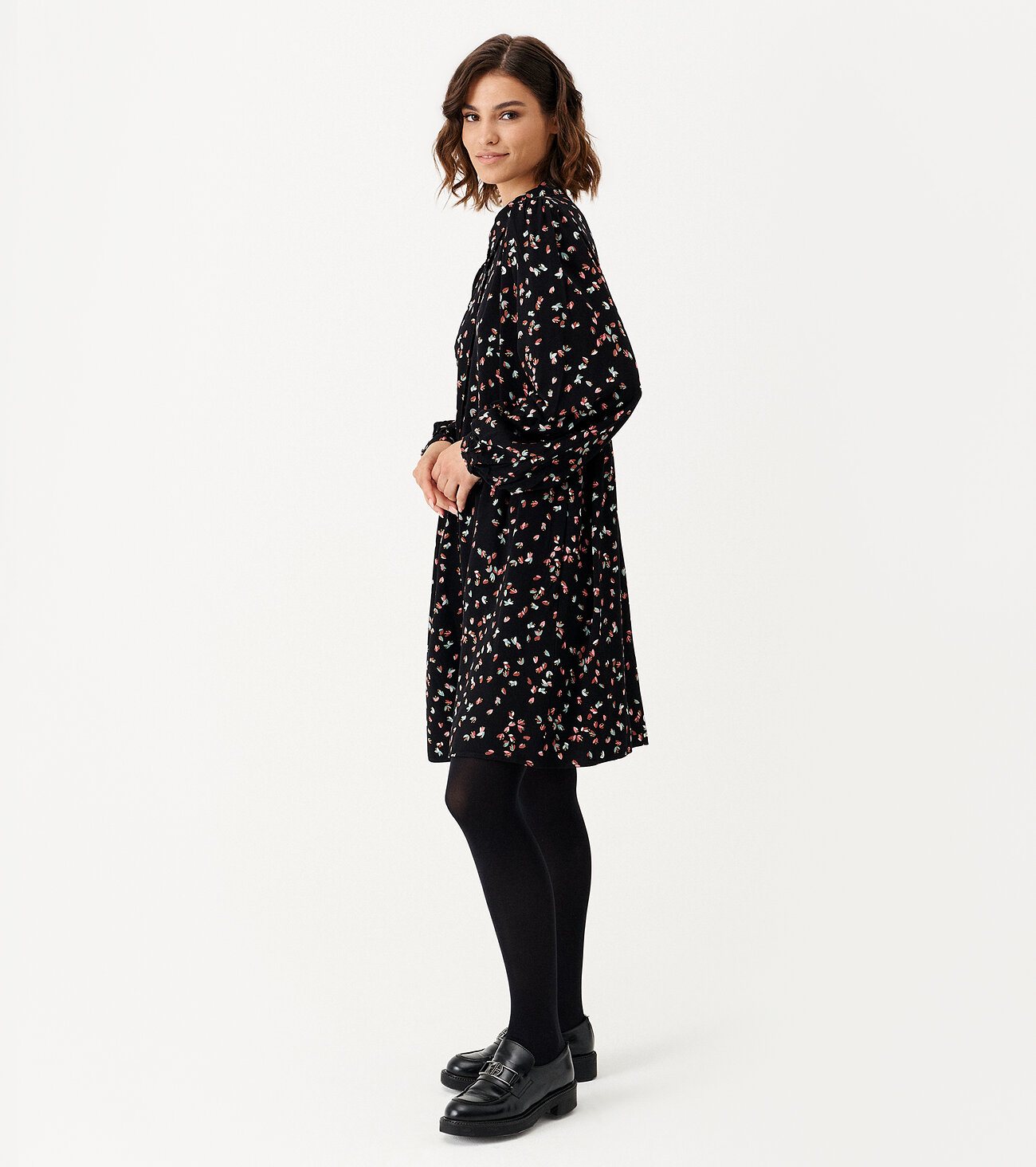 Платье женское из вискозной ткани для повседневной носки. Без подкладки. Платье прямого силуэта с прорезными карманами в боковых швах, Платье отрезное по талии. Воротник-стойка. Застежка фронтальная на пуговицы. Рукава длинные оформлены манжетой.Размер 42: Длина изделия - 90см, Длина рукава - 64см, Ширина плеча - 9.8см, Ширина по бедрам - 86см, Ширина по груди - 50см, Ширина по талии - 54см, Ширина рукава - 22.2см;