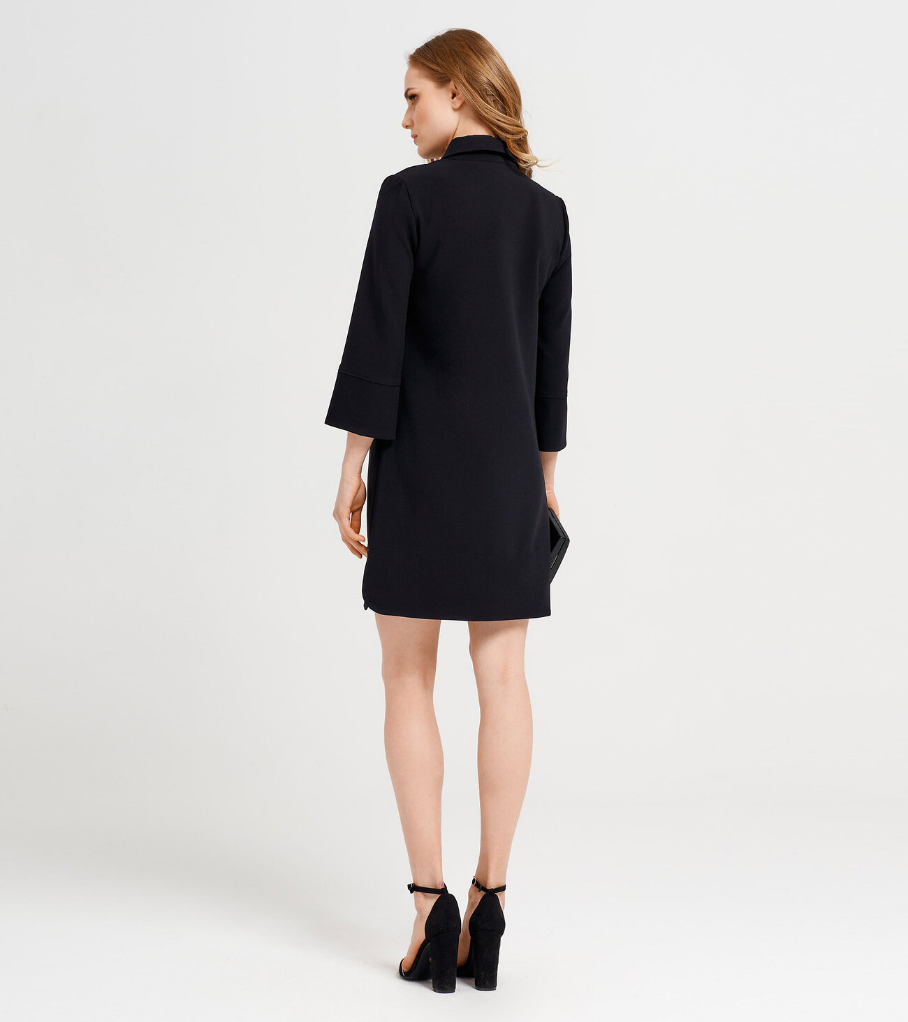 Платье рубашка женское прямого покроя делает фигуру стройнее и утонченнее. Модель с отложным воротником рубашечного типа застегивается на ряд пуговиц, расположенных по вертикальной планке. Платье женское осеннее создано с втачными, чуть расширенными к низу, рукавами длиной 7/8 и прорезными карманами в боковых швах. Размер 42: Длина рукава - 47см, Длина спинки - 86см, Длина до талии - 41,8см, Обхват шеи - 39,4см, Ширина плеча - 10,8см, Ширина по бедрам - 48см, Ширина по груди - 46см, Ширина рукава - 16,2см;
