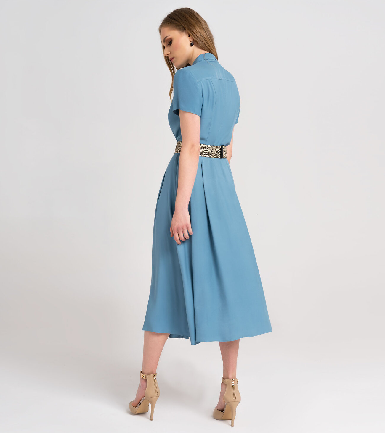 Платье из вискозной ткани . Платье прилегающего силуэта до талии, юбка расширенная, длина миди, платье с цнтральной застежкой на петли пуговицы , с кокетками, с рельефами до талии, юбка с глубокими складками. Спинка , с кокеткой, с рельефами , средним швом до талии , юбка с глубокими складками. В комплект платья входит пояс из основной ткани. Шикарный образ как по случаю так и без.Размер 50: Дл.спины от высшей плечевой точки до талии - 40,6см, Длина рукава - 18,5см, Длина спинки - 117см, Обхват шеи - 40,5см, Ширина плеча - 11,6см, Ширина по груди - 53см, Ширина по талии - 45,5см, Ширина рукава - 18,3см;