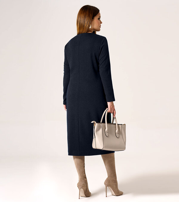 Мягкое и элегантное платье прилегающего силуэта выполнено из приятного на ощупь трикотажа.Рукав втачной ,длинный. Вырез горловины асимметричный,декорирован деталью со складкой,имитирующей воротник. На уровне ниже далии выполнен асимметричный подрез,декорированный пряжкой. Нижеподреза офирмлены складка,переходящая в шлицу снизу, и косой вход во внутренний карман. Длина платья ниже колена. Практичное и стильное платье на каждый день и для работы в прохладную погоду.Размер 54: Дл.спины от высшей плечевой точки до талии - 43,5см, Длина изделия - 110,5см, Длина рукава - 62см, Ширина плеча - 11,8см, Ширина по бедрам - 59см, Ширина по груди - 57см, Ширина рукава - 19,7см;