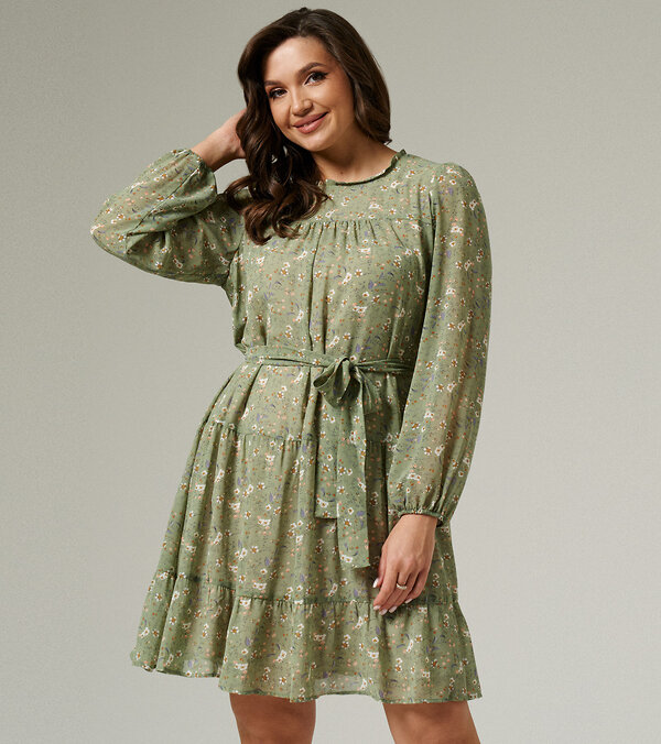 Романтичное женское платье из лёгкой струящейся ткани, в нежный принт. Силуэт расширенный. Платье по переду и спинке имеет отрезную кокетку, по шву присборено. По низу платья отрезной волан со сборкой. По спинке кокетка с разрезом петелькой для застёгивания. Горловина оформлена рюшей из основной ткани. Рукав длинный, свободный. Низ рукава присобран по нижнему срезу на резинку. Платье на подкладке. Нет никаких сомнений в том, что обладательница этого платья, будет выглядеть безупречно.Размер 44: Длина изделия - 92см, Длина рукава - 62см, Длина спинки - 40см, Ширина плеча - 8,8см, Ширина по бедрам - 82см, Ширина по груди - 57см, Ширина рукава - 20см;