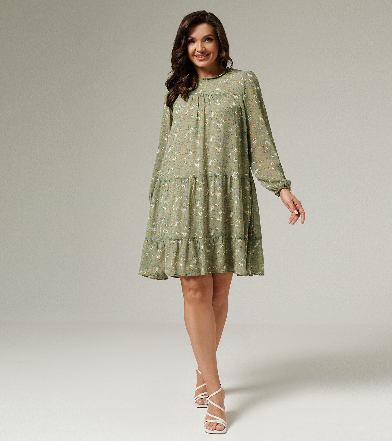 Романтичное женское платье из лёгкой струящейся ткани, в нежный принт. Силуэт расширенный. Платье по переду и спинке имеет отрезную кокетку, по шву присборено. По низу платья отрезной волан со сборкой. По спинке кокетка с разрезом петелькой для застёгивания. Горловина оформлена рюшей из основной ткани. Рукав длинный, свободный. Низ рукава присобран по нижнему срезу на резинку. Платье на подкладке. Нет никаких сомнений в том, что обладательница этого платья, будет выглядеть безупречно.Размер 44: Длина изделия - 92см, Длина рукава - 62см, Длина спинки - 40см, Ширина плеча - 8,8см, Ширина по бедрам - 82см, Ширина по груди - 57см, Ширина рукава - 20см;