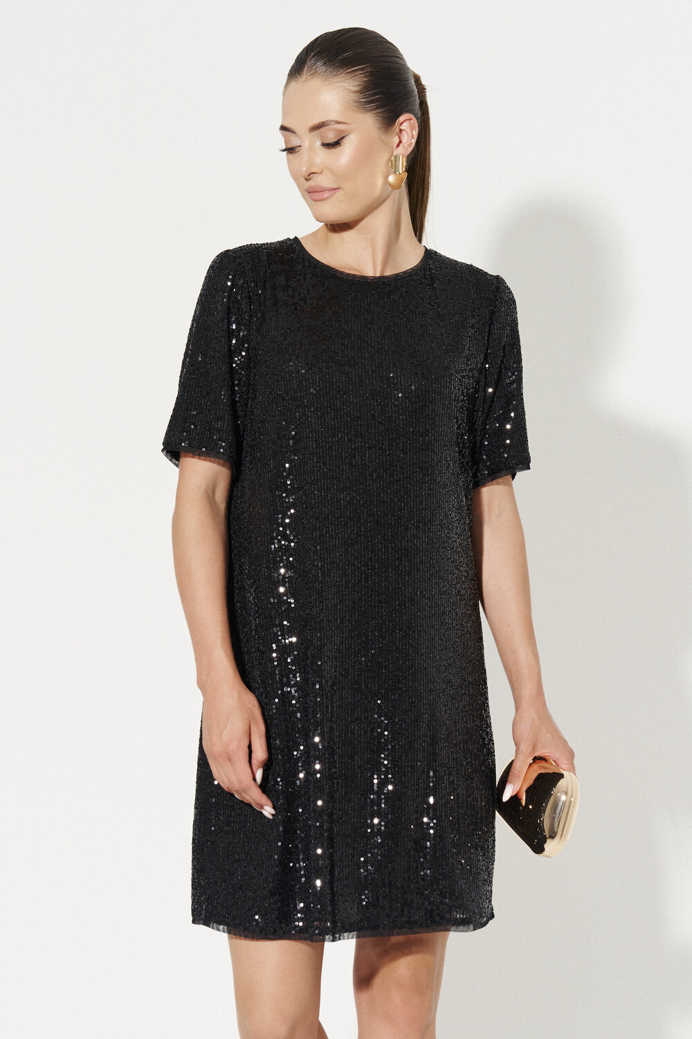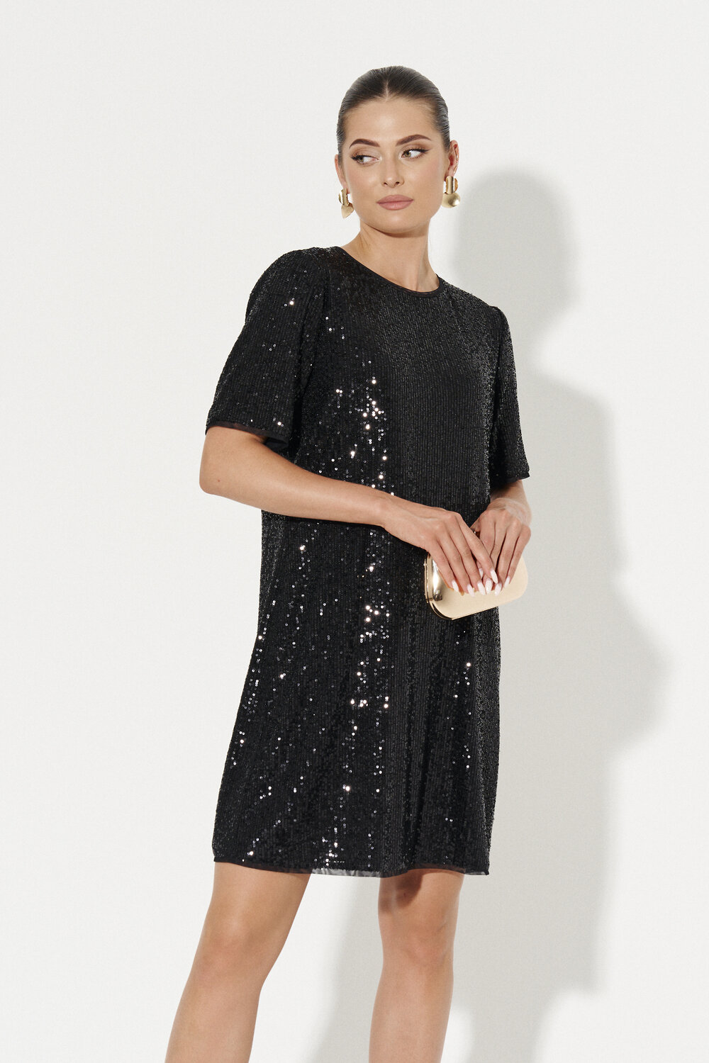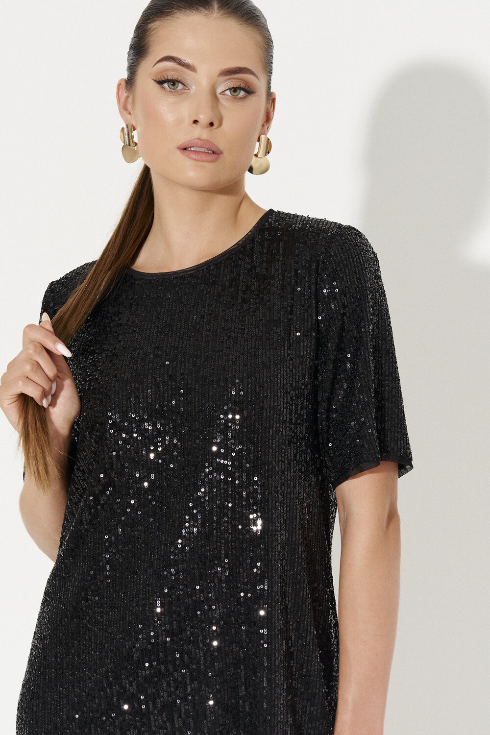 Платье женское из ткани с пайетками прямого силуэта для торжественных случаев. Горловина круглая. Рукав короткий. Низ рукава и низ платья обработан кантом из сетки. Платье полностью на подкладке. Подкладка вискозная, очень приятная к телу. Очень изысканное платье на все случаи жизни, комфортное в носке и с безупречной посадкой по телу.Размер 44: Длина изделия - 89см, Длина рукава - 27см, Ширина плеча - 10см, Ширина по бедрам - 54см, Ширина по груди - 50см;