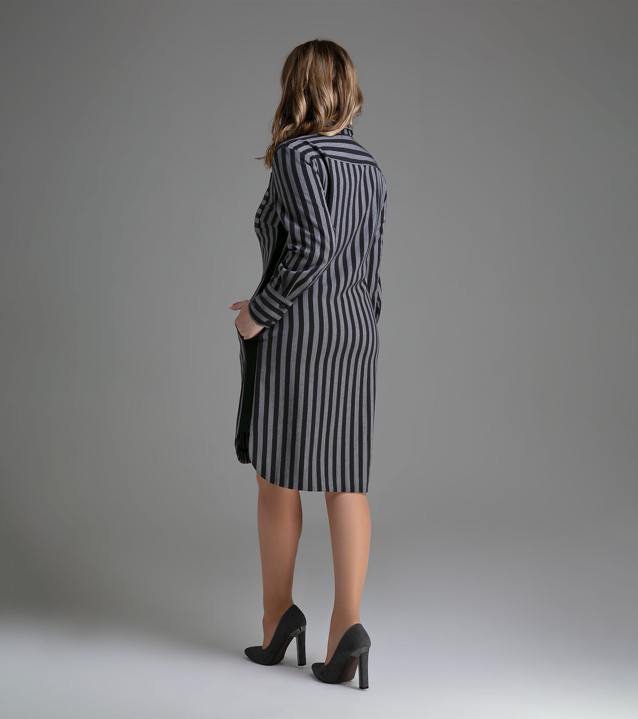 Осеннее стильное платье-рубашка-тренд этого года. Рукав рубашечный,чуть расширенный книзу и прихваченный на высокий манжет.Воротник рубашечный. Форма низа фигурная. Спинка длиннее переда.Трикотажные отрезные бочки дают свободу движениям и визуально стройнят фигуру.Застёжка по переду на кнопки.Два накладных кармана по переду.Правый карман декорирован пришивными стекло-стразами.Игра полоски привносит динамику в образ.Размер 46: Длина изделия - 100.5см, Длина рукава - 60.5см, Обхват шеи - 48см, Ширина плеча - 13.3см, Ширина по бедрам - 54см, Ширина по груди - 51см, Ширина рукава - 19см;