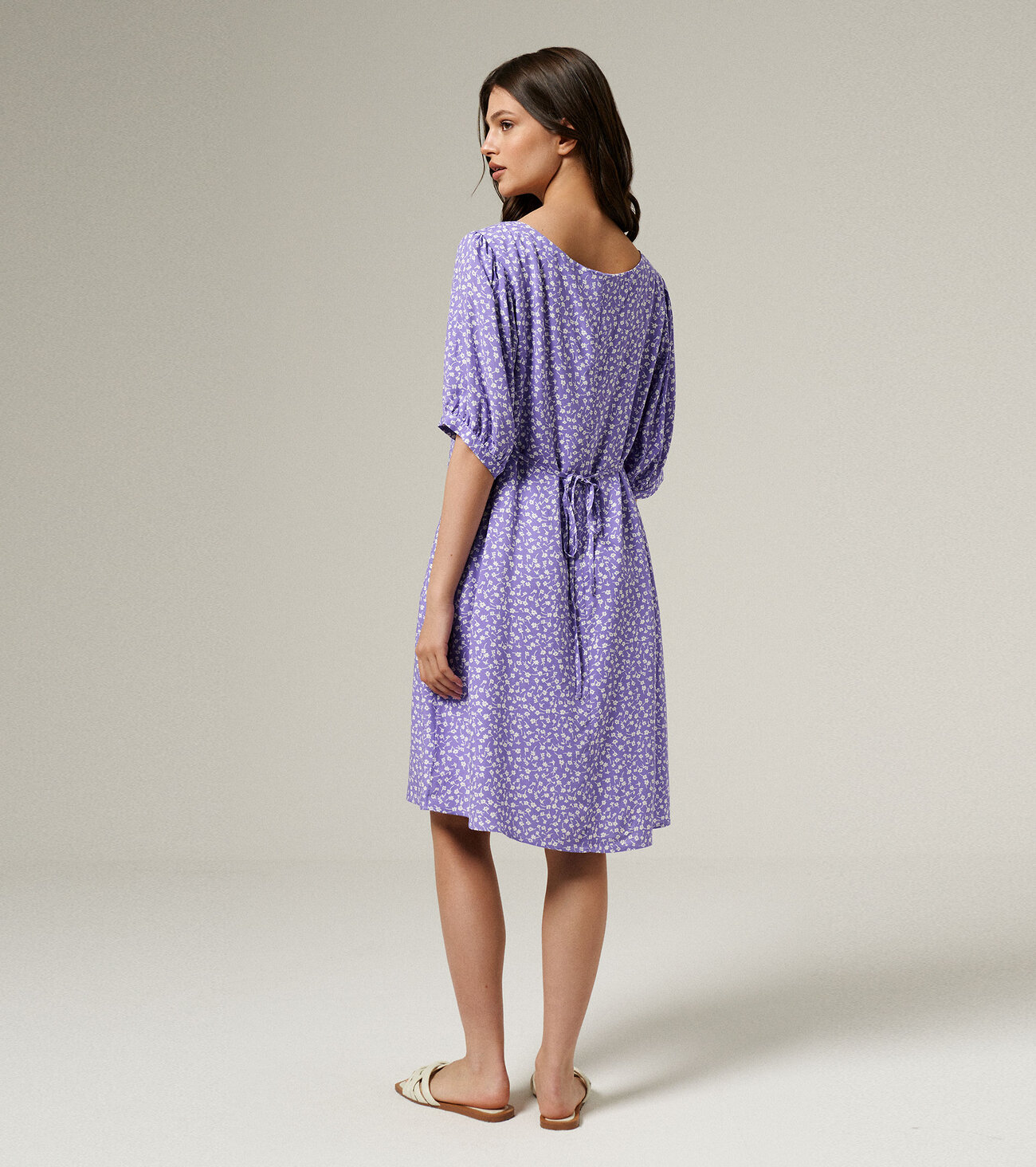 Платье женское полуприлегающего силуэта для повседневной носки. Платье на вискозной подкладке с коротким втачным рукавом оформленым притачной манжетой. Перед с подрезом под грудью и сборкой. Молния в среднем шве спинки. В боковые швы вставлены шнурки для приталивания, завязывающиеся на спине. Длина изделия до середины бедра.Размер 42: Дл.спины от высшей плечевой точки до талии - 42см, Длина изделия - 90см, Длина рукава - 30см, Ширина плеча - 6,3см, Ширина по бедрам - 58см, Ширина по груди - 49,5см, Ширина рукава - 27,5см, Ширина рукава внизу - 15,8см;