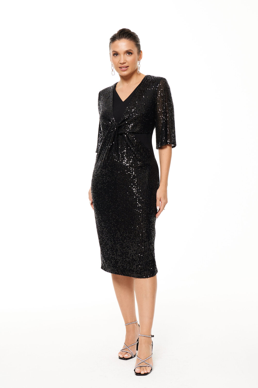 Платье женское полуприлегающего силуэта для торжественных мероприятий. Перед имеет перекрут с отрезной частью переда и низа изделия. В целом платье из трикотажного полотна, а отрезная часть переда и рукава из пайеток. Спинка со средним швом и с двумя талиевыми вытачками, в среднем шве имеется шлица. Горловина V-образная. Рукава длиной до локтя. Платье на подкладке. Очень изящное и элегантное платье, с которым вы всегда будете в центре внимания.Размер 46: Длина изделия по спинке - 106см, Длина рукава - 36см, Ширина плеча - 11.3см, Ширина по бедрам - 50см, Ширина по груди - 47см, Ширина по талии - 42см, Ширина рукава вверху - 19см, Ширина рукава внизу - 25.5см, Ширина спинки - 36.5см;