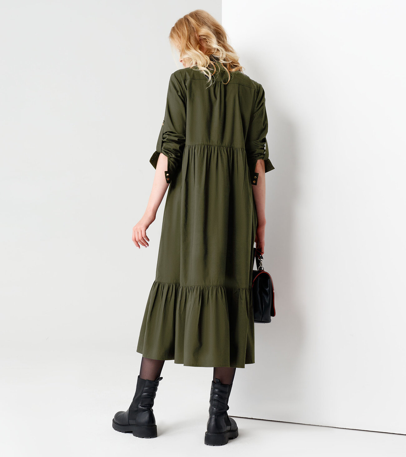 Модное молодежное платье из хлопковой ткани. Платье расширенного силуэта, с центральной сквозной застежкой на петли и пуговицы. Платье длиной "миди" с декоративными подрезами и сборкой. Рукава длинные, по низу притачная манжета с петлями и пуговицами. Воротник рубашечный. В боковых швах имеются карманы. Очень стильный комфортный вариант для повседневной носки.Размер 42: Длина изделия - 122см, Длина рукава - 62см, Обхват шеи - 43,5см, Ширина плеча - 12см, Ширина по бедрам - 73см, Ширина по груди - 48см, Ширина по подрезу - 45см, Ширина рукава - 16,5см;
