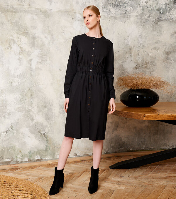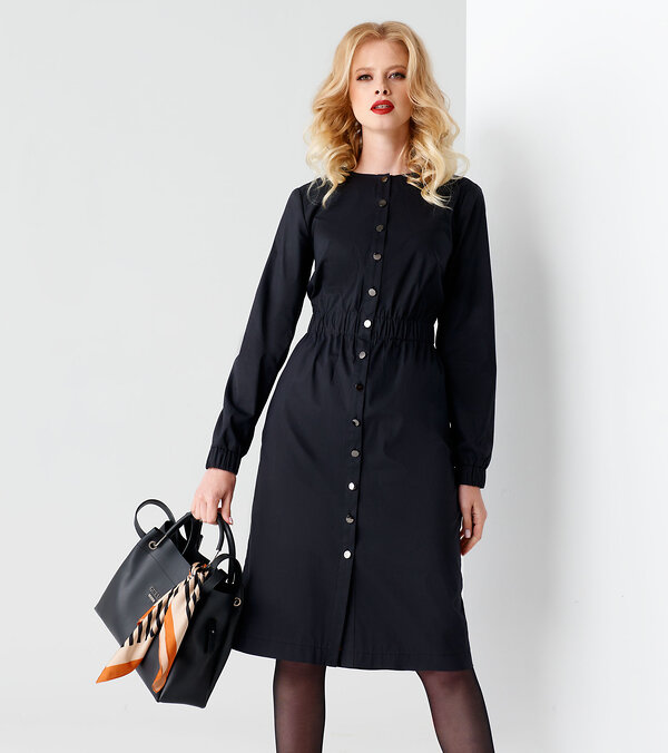 Стильное и лаконичное хлопковое платье .Лаконичное и простое по силуэту платье подчёркивает стройность фигуры. Силуэт прямий.На уровне талии и по низу рукавов оформлена широкая резинка. Застёжка спереди на планку с петлями и пуговицами. Вырез горловины круглый. В состав ткани платья входит эластан, поэтому оно удобно в эксплуатации. Эффектный вариант платья для яркой девушки, которая предпочитает в одежде стиль, минимализм и строгость.Размер 44: Длина изделия - 105см, Длина рукава - 62см, Ширина плеча - 10,8см, Ширина по бедрам - 54см, Ширина по груди - 47см, Ширина по талии - 39см, Ширина рукава - 16,5см;