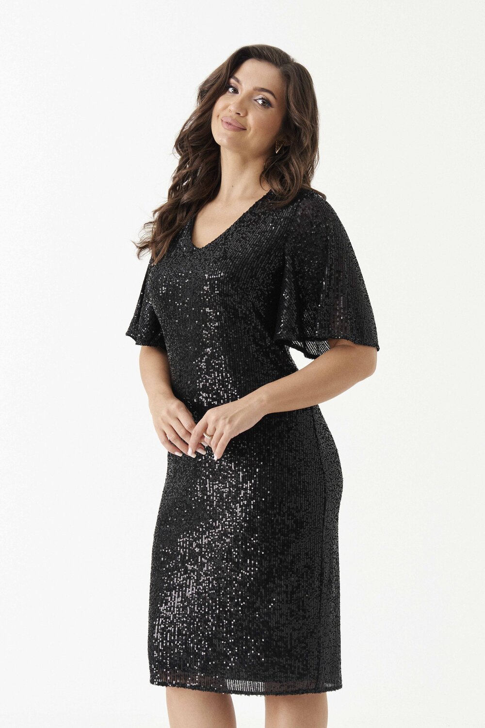 Платье женское из струящейся ткани с пайетками для торжественных мероприятий. Перед имеет нагрудные вытачки. Спинка со средним швом и застежкой- молнией в шве, а так же по спинке располагаются две талиевые вытачки и разрез в среднем шве платья. Горловина V образная. Рукава рисширены к низу, длина рукава до уровня локтя. Длина платья чуть ниже коленаю. Очень красивое и элегантное платье в котором вам обязательно сделают комплимент.Размер 48: Длина изделия - 103см, Длина рукава - 30см, Ширина по бедрам - 53см, Ширина по груди - 49см, Ширина по талии - 44см;
