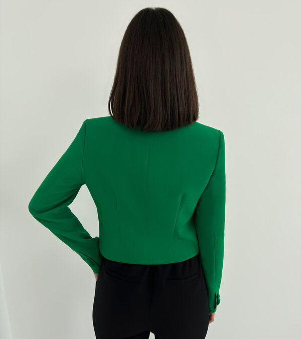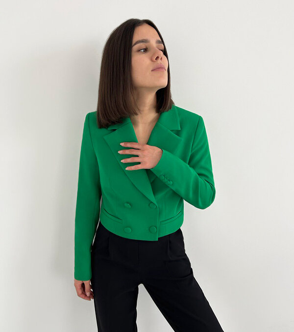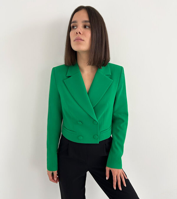 Элегантный жакет женский - модная вещь для работы и особых случаев. Укороченные жакеты стали хитом сезона, и эта модель не исключение! Приталенный жакет женский трикотажный с английским воротником позволит создать стильные и женственные образы с юбками, широкими брюками, кожаными шортами и даже джинсами. Короткий жакет изготовлен из ткани, которая буквально «дышит» и хорошо пропускает воздух. Благодаря свойствам ткани полуприлегающий силуэт не стесняет движений. Гладкий укороченный жакет дополнен тактильно приятной подкладкой. Двубортный жакет женский на пуговицах, обшитых в цвет ткани, оформлен боковыми декоративными рамками. Они имитируют форму нагрудных карманов с листочкой. Длинные втачные рукава со шлицей и пуговицей. Размер 42: Длина изделия - 43см, Длина рукава - 62см, Ширина плеча - 12см, Ширина по груди - 47см, Ширина по низу - 41см, Ширина рукава - 16см;